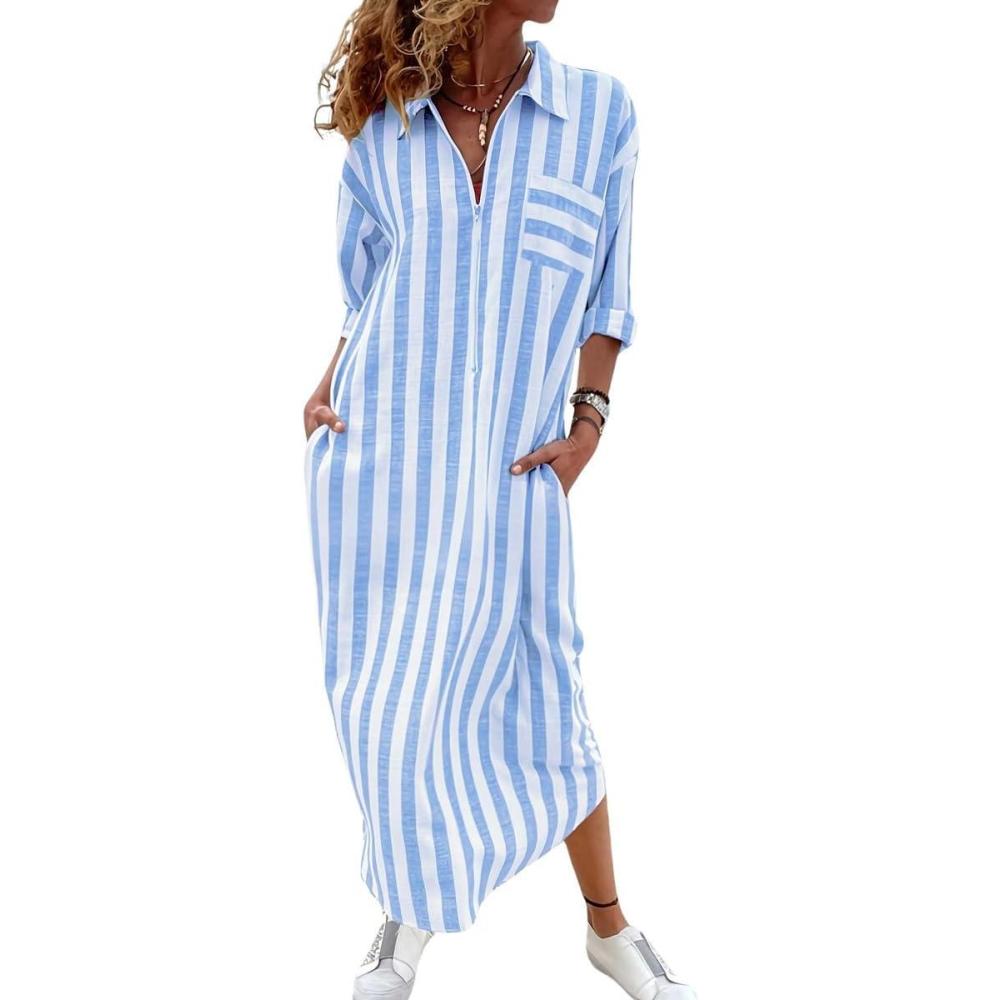 chouyatou Women’s Summer 3/4 Sleeve Striped Shirt Dress Business Casual Half Zipper Maxi Long Beach Dress(Blue)