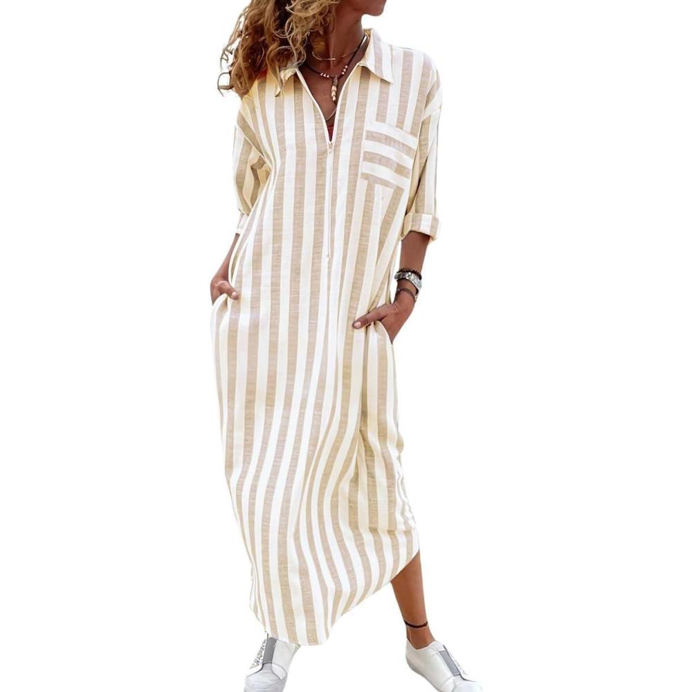 chouyatou Women’s Summer 3/4 Sleeve Striped Shirt Dress Business Casual Half Zipper Maxi Long Beach Dress(Khaki)