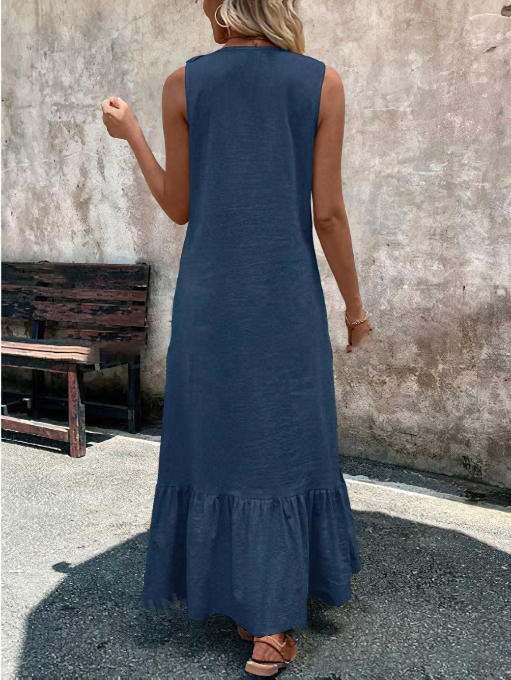 chouyatou Women's Summer Beach Cotton Tank Dress Linen Boho Sleeveless Tiered Ruffle Maxi Long Sundress(Dark Blue)
