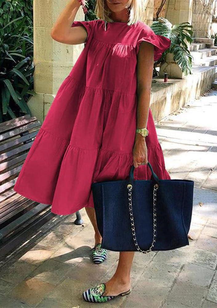 chouyatou Women’s Summer Flutter Sleeve Tiered Babydoll Dress Cute A-Line Midi Long Tunic Dress(Rose Red)