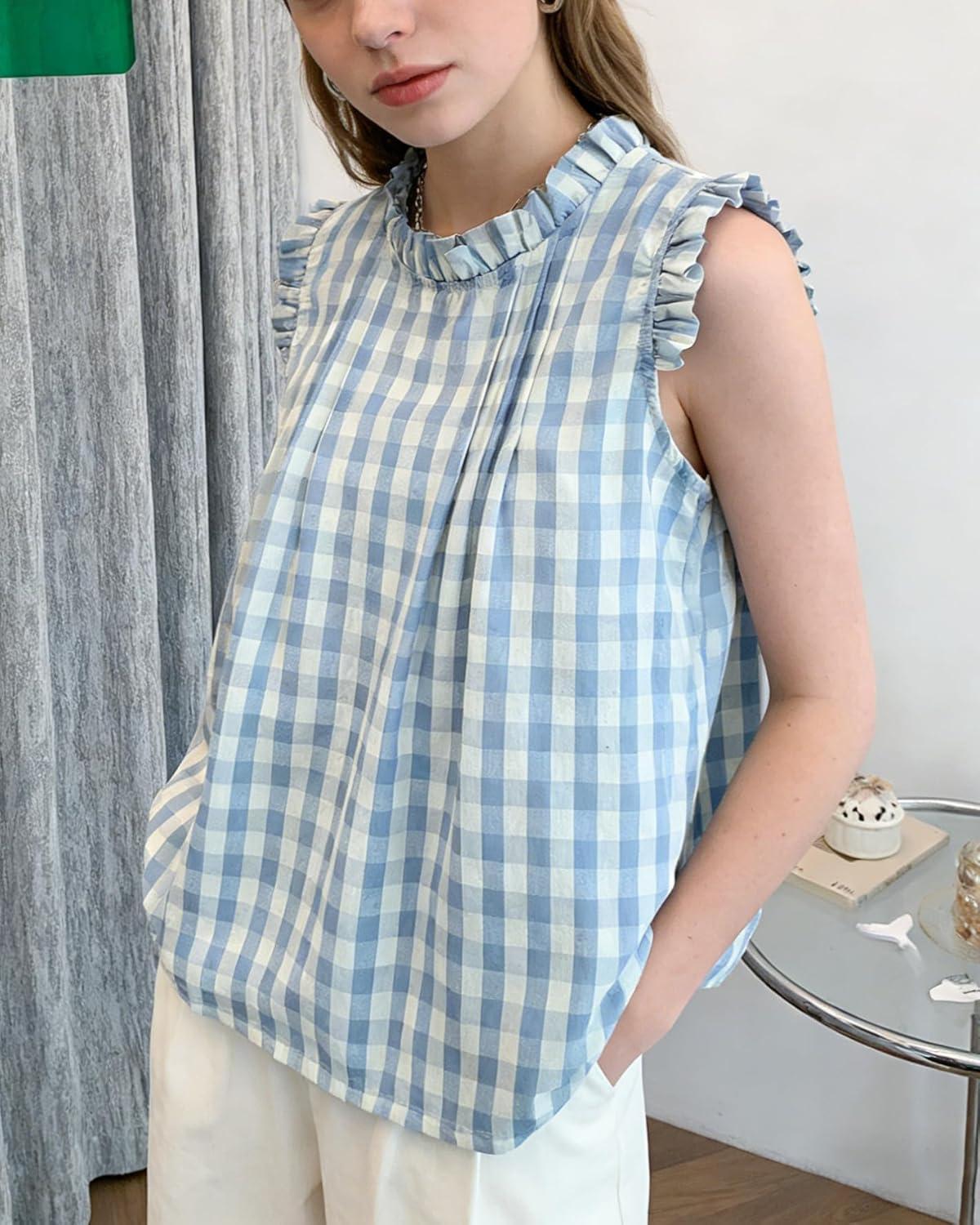 chouyatou Womens Summer Ruffle Sleeve Gingham Cotton Shirt Bowknot Plaid Blouses Pleated Tunic Tank Tops(Blue)
