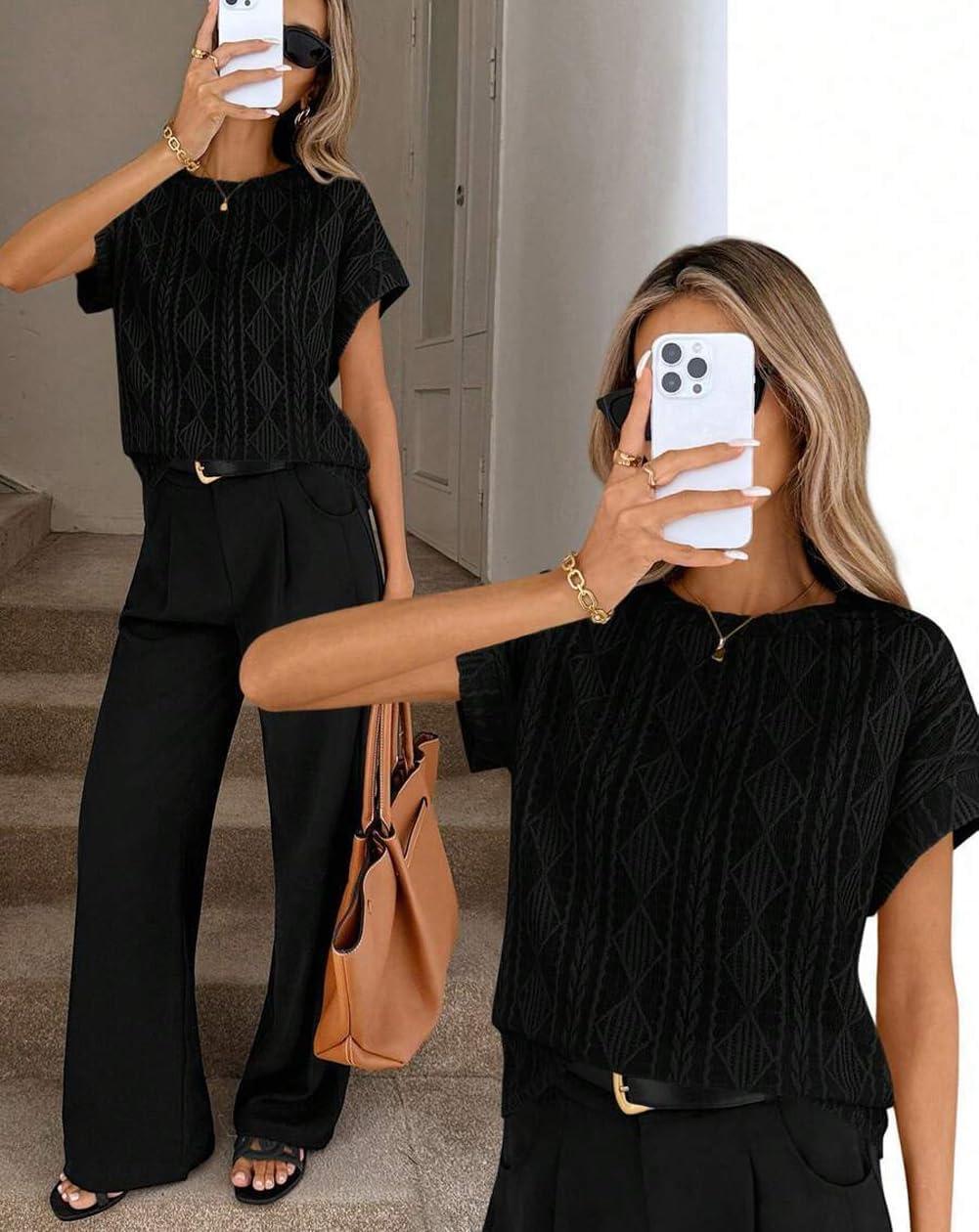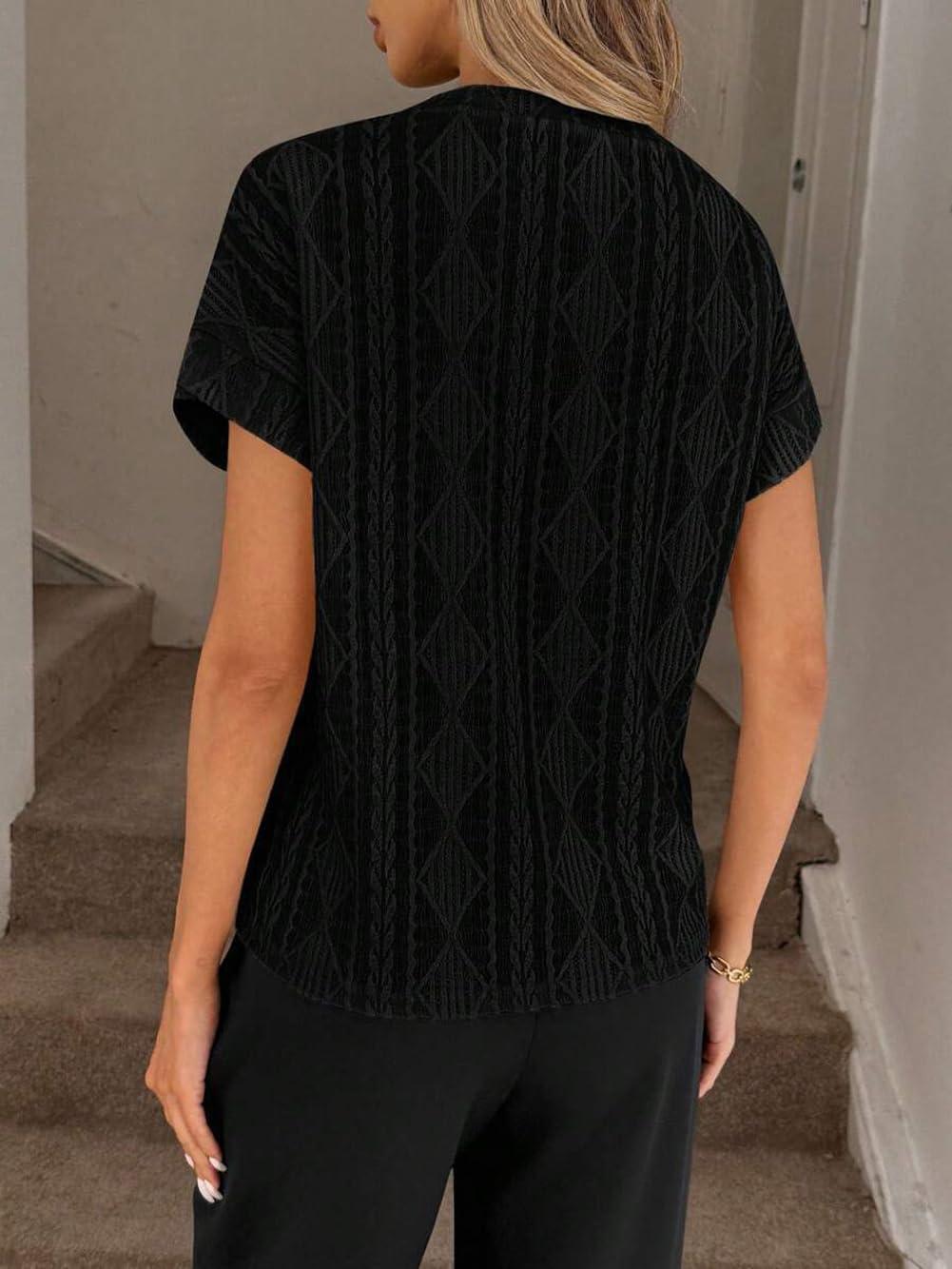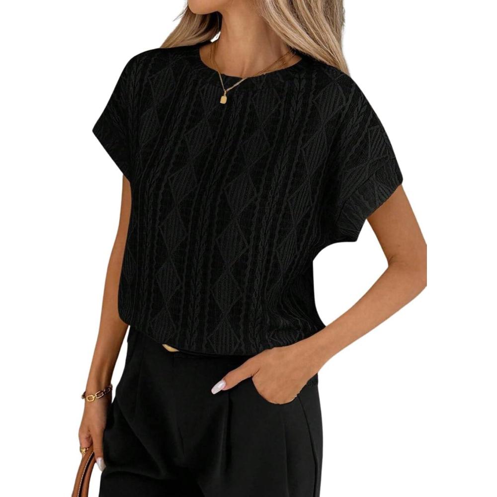 chouyatou Women’s Summer Short Sleeve Casual T-Shirt Floral Jacquard Knit Round Neck Basic Tee Top Blouse(Black)