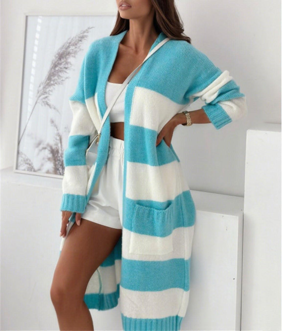 chouyatou Women’s Trendy Striped Knit Cardigan Color Block Open Front Mid Long Sweater Jacket Coat(Azure)