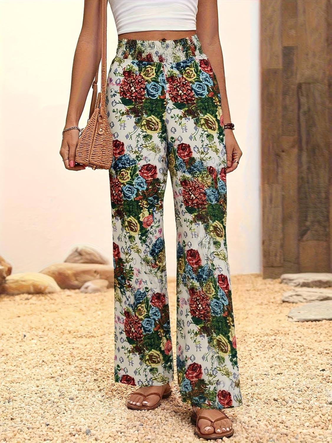 chouyatou Women’s Vintage Floral Printed Wide Leg Pants Smocked Elastic Waist Beach Palazzo Pants(Beige)
