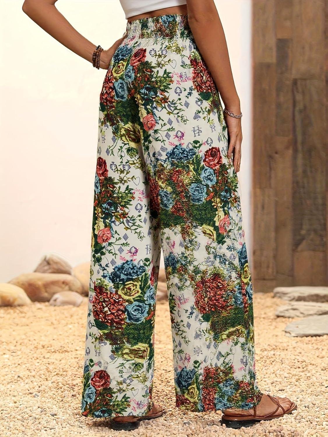 chouyatou Women’s Vintage Floral Printed Wide Leg Pants Smocked Elastic Waist Beach Palazzo Pants(Black)