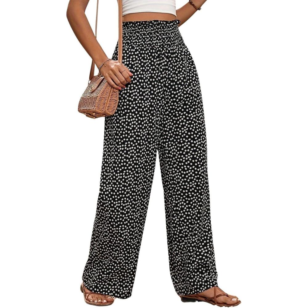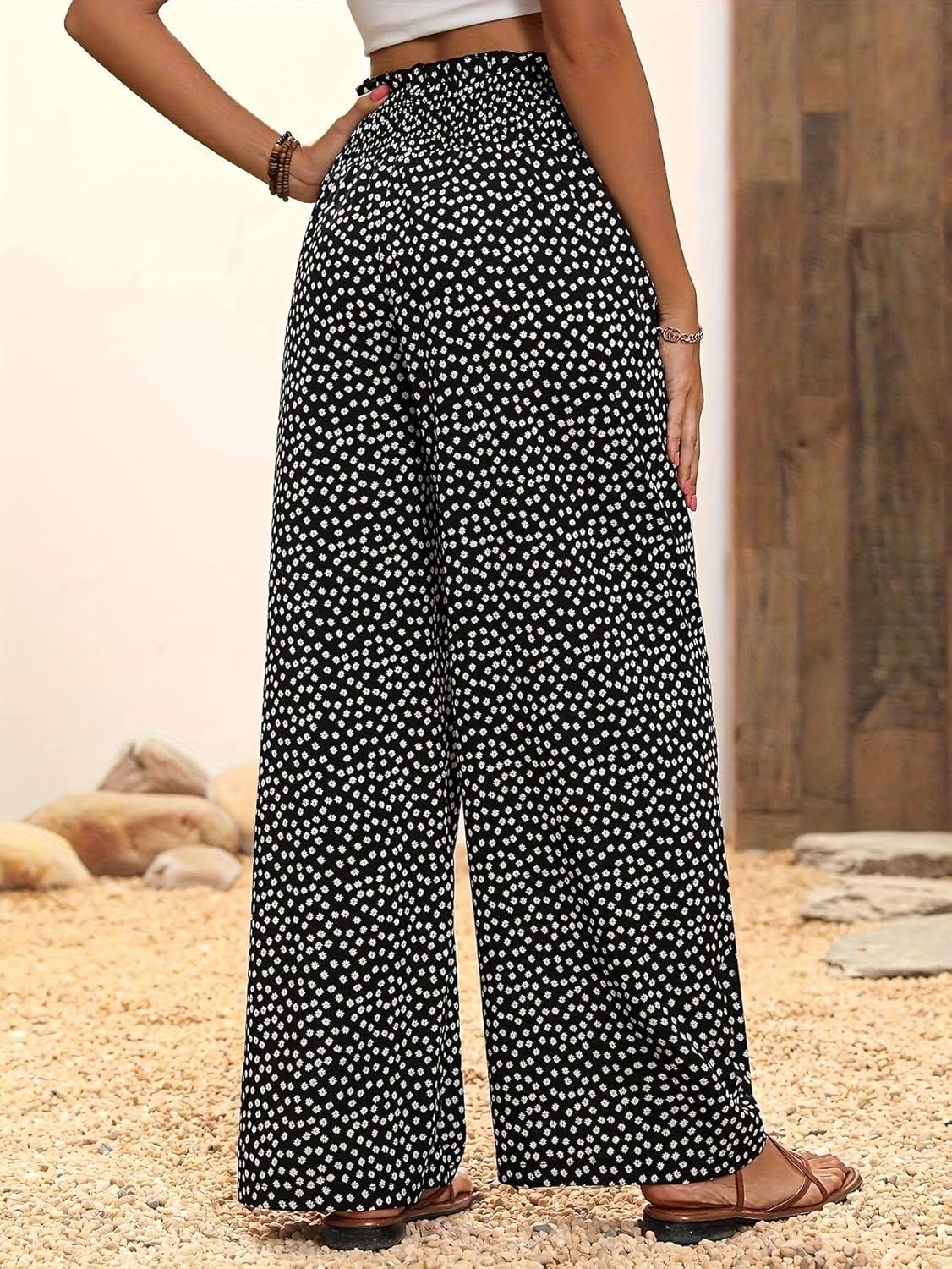 chouyatou Women’s Vintage Floral Printed Wide Leg Pants Smocked Elastic Waist Beach Palazzo Pants(Black)