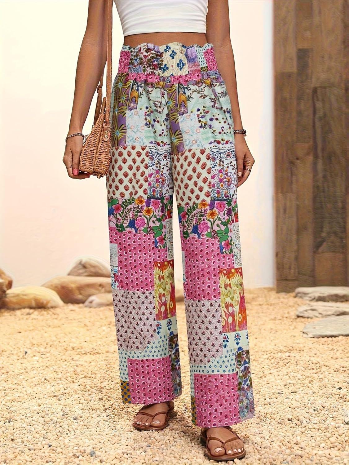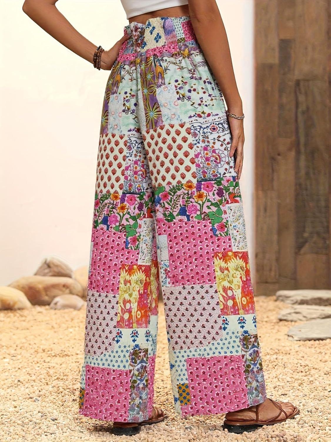 imagechouyatou Womens Vintage Floral Printed Wide Leg Pants Smocked Elastic Waist Beach Palazzo PantsRed