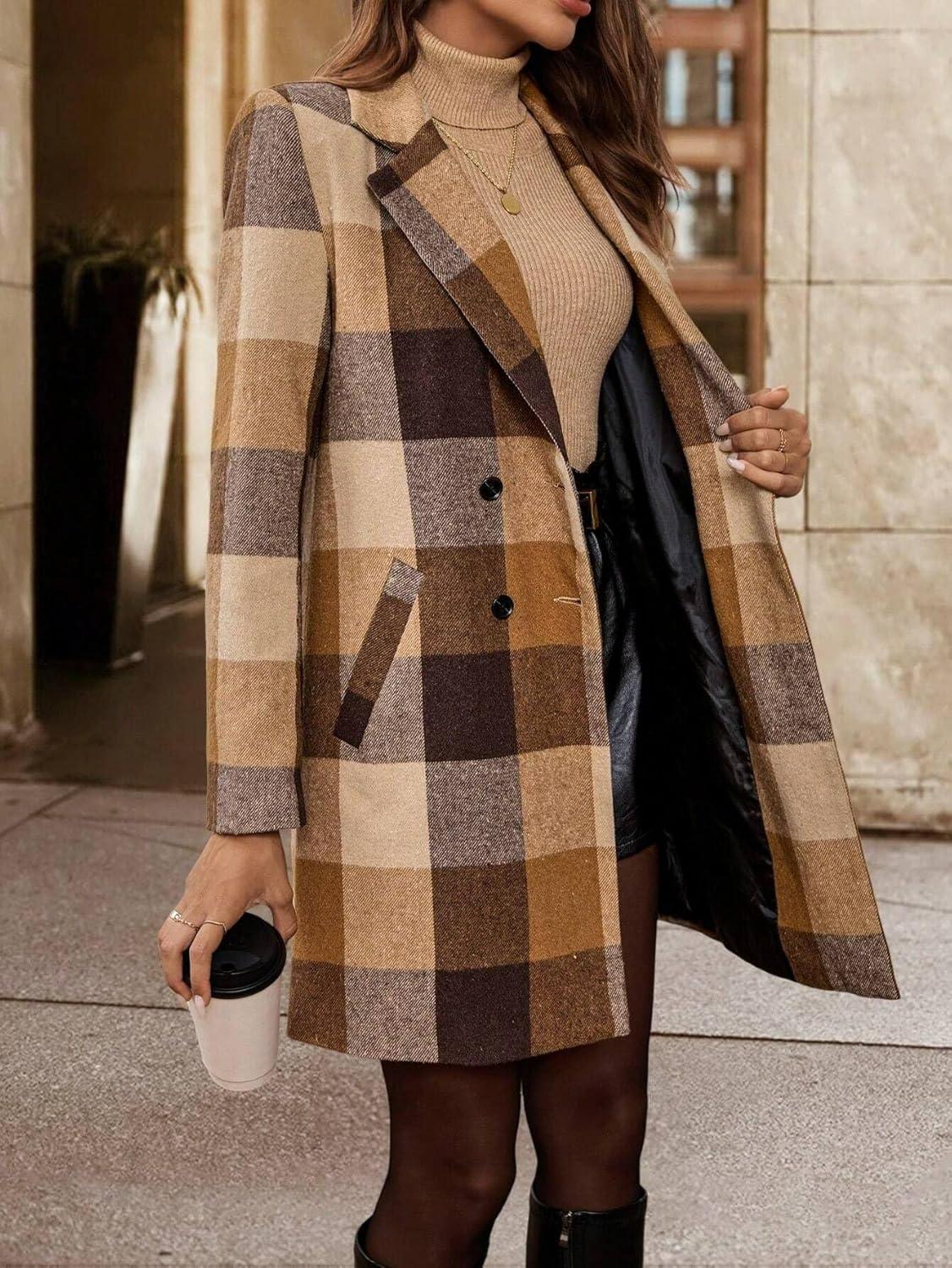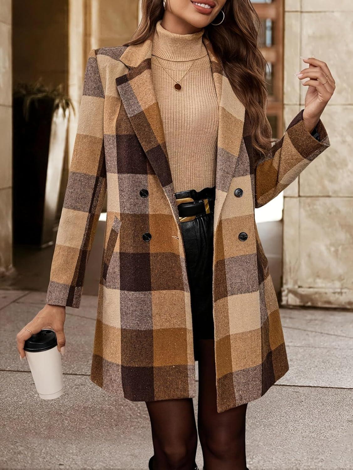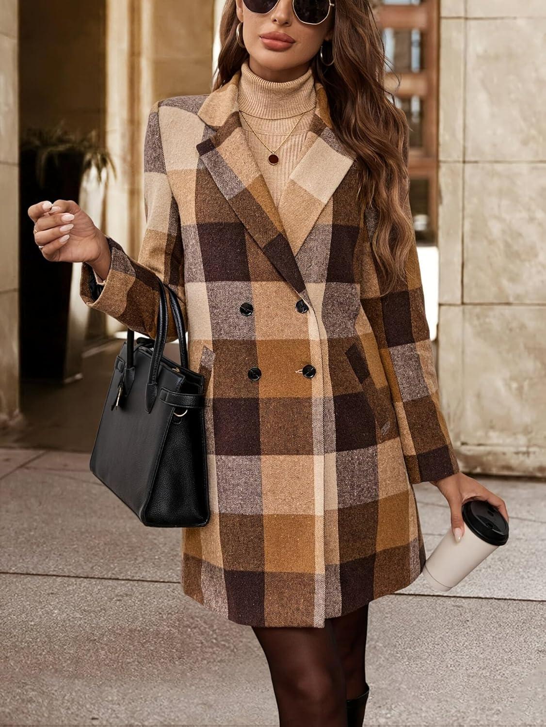 chouyatou Women’s Vintage Plaid Pea Coat Double Breasted Wool Coat Mid Long Blazer Jacket Outerwear Overcoat(Khaki)