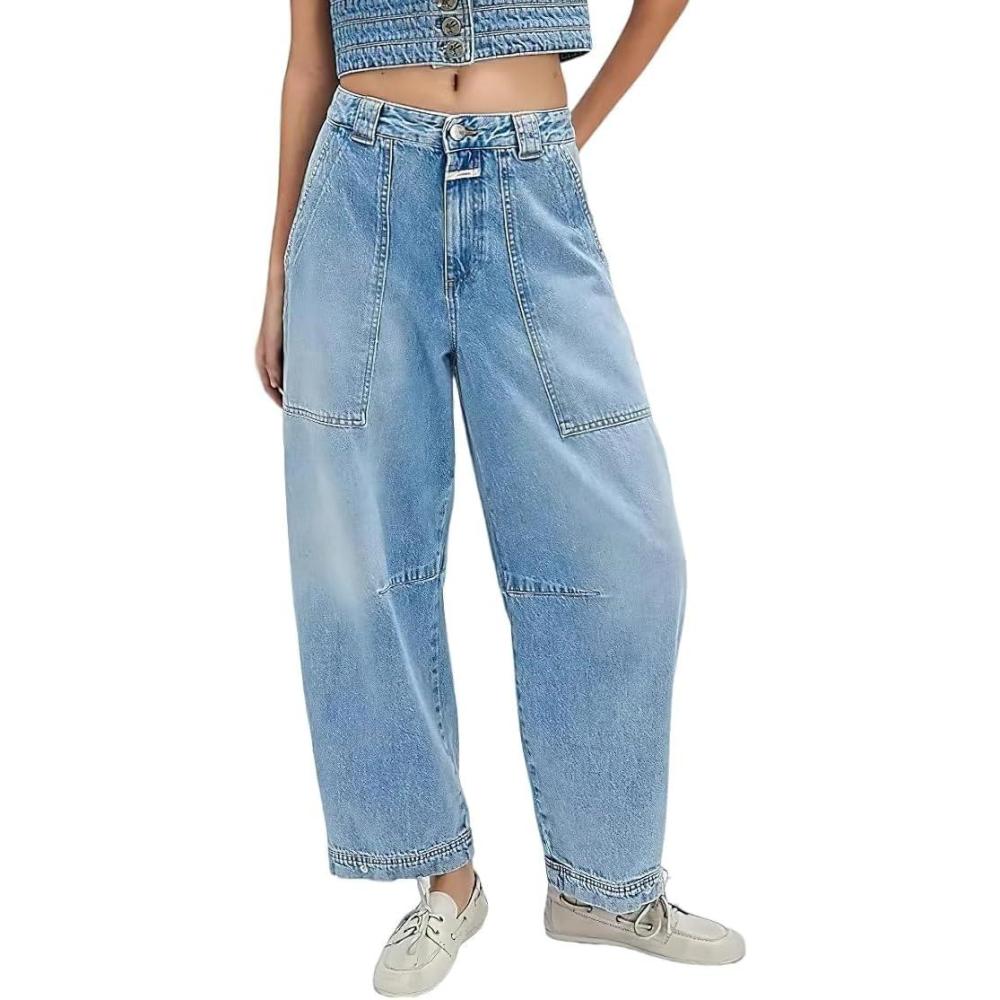 imagechouyatou Womens Wide Leg Barrel Jeans Button Fly High Waist Relax Fit Baggy Washed Denim Pants with PocketsLight Blue