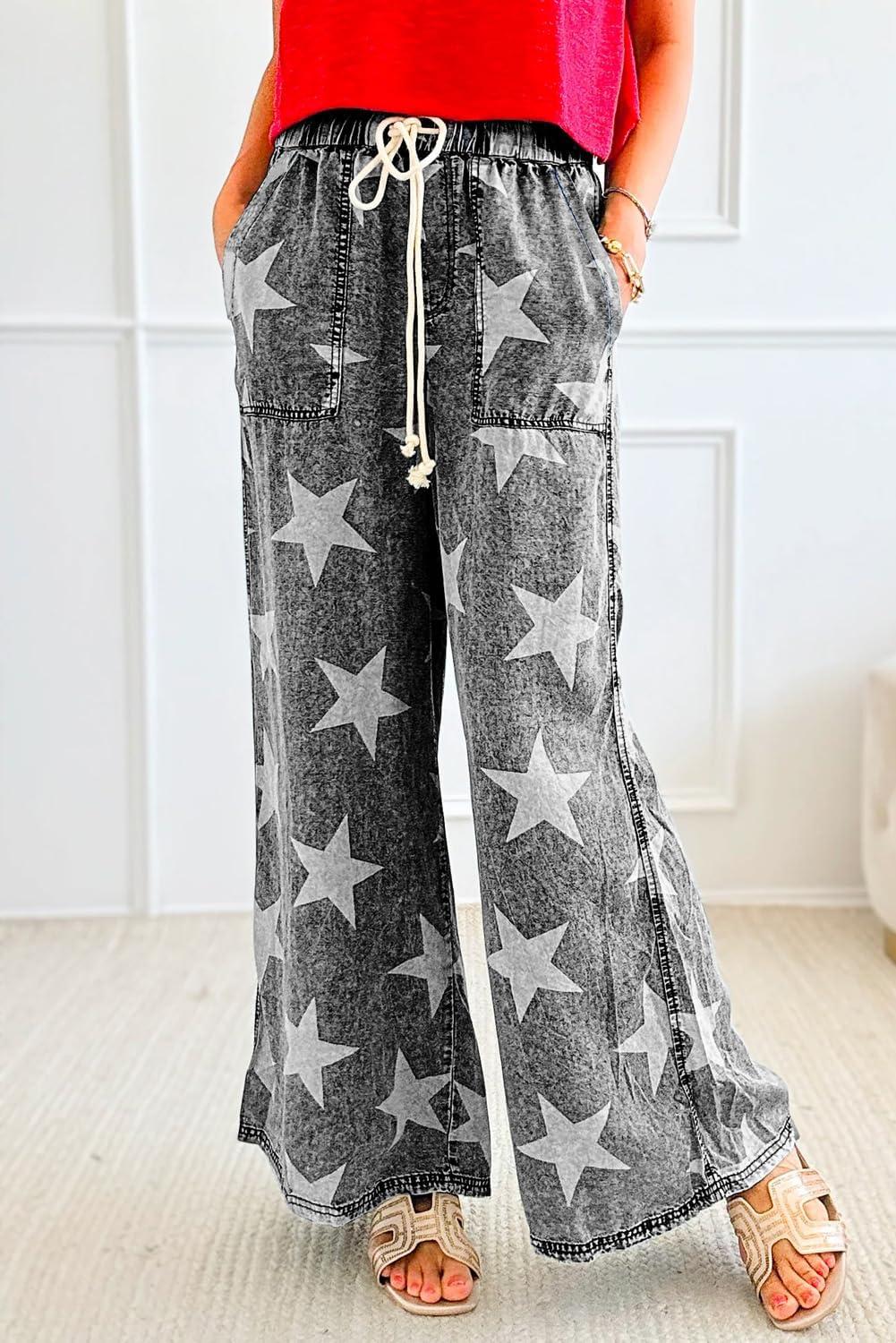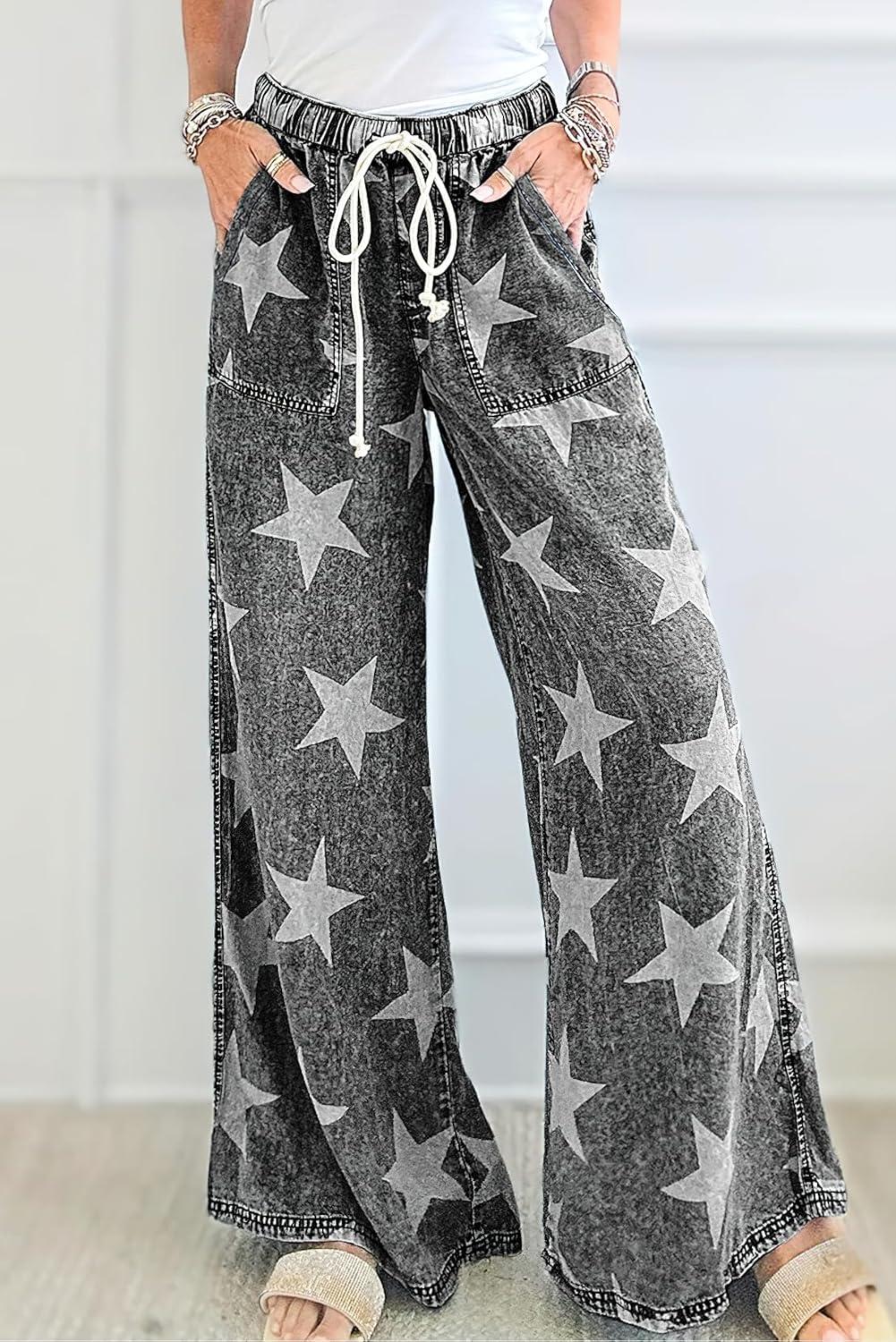 Get the chouyatou Women’s Wide Leg Star Printed Jeans Barrel Elastic High Waisted Drawstring Flare Denim Pants(Black Grey) you want at a price you can afford with our markdown sale.