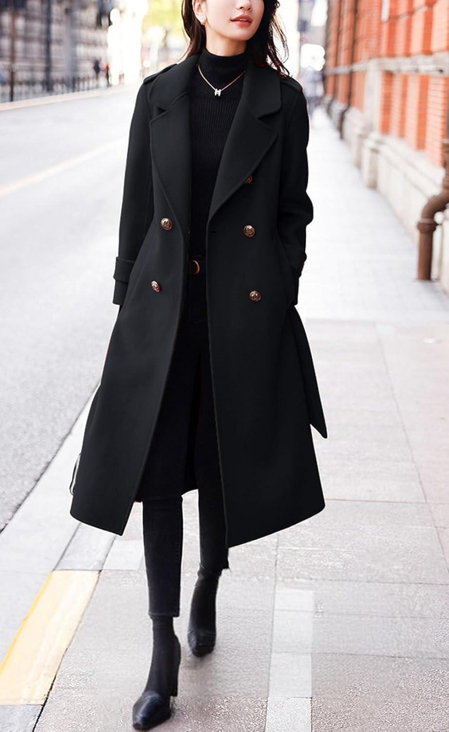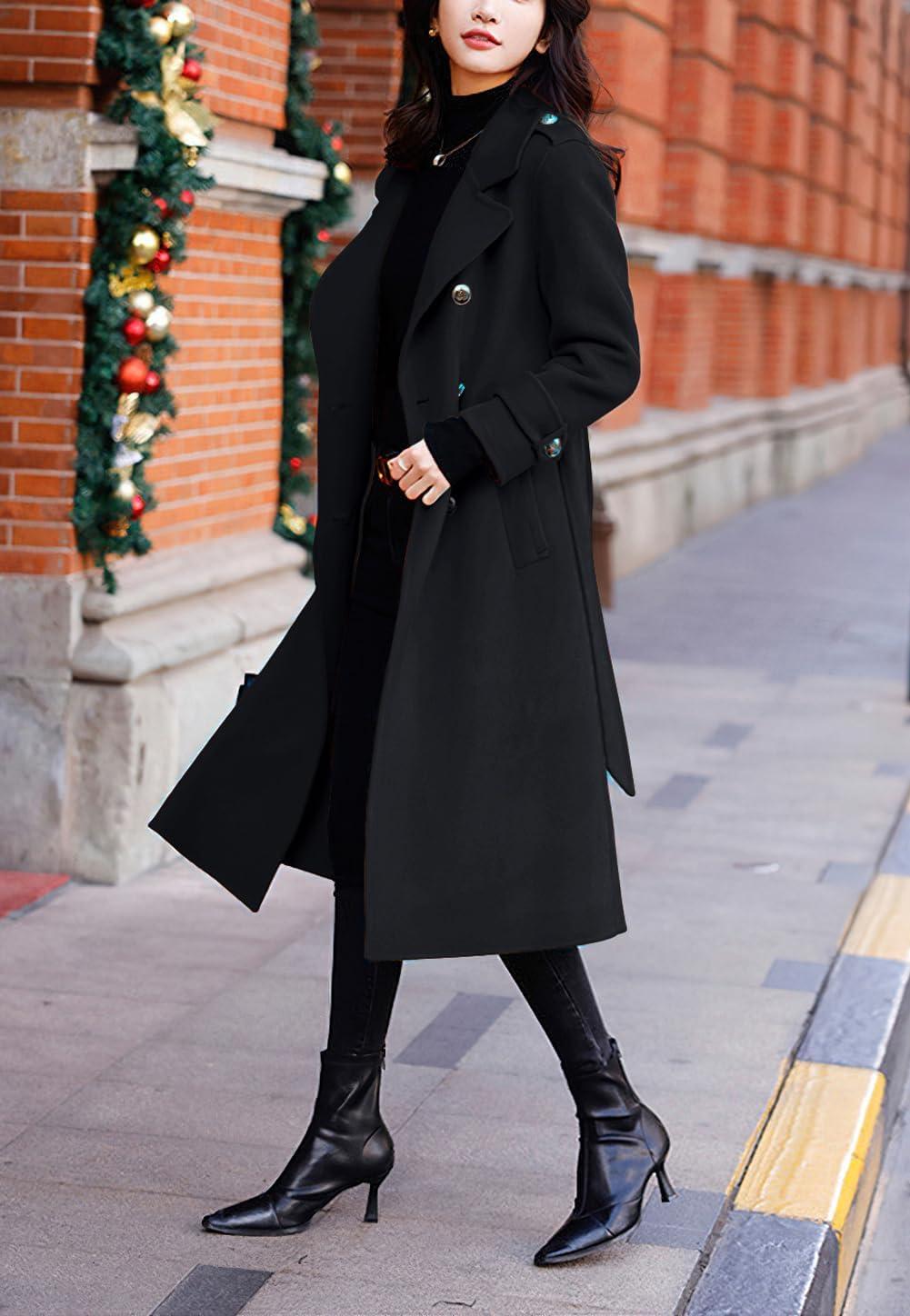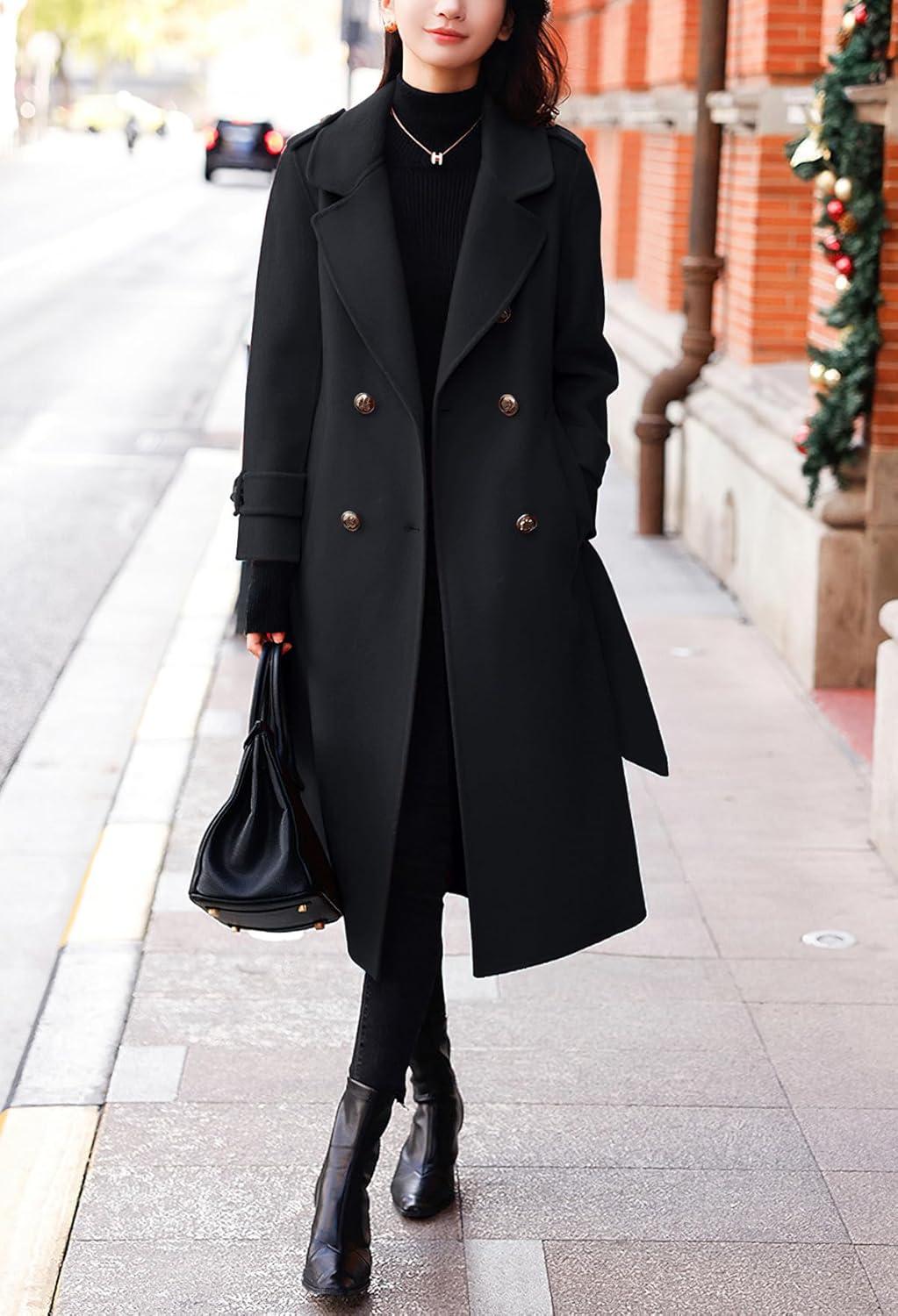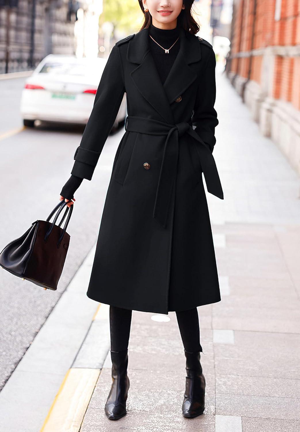 chouyatou Women's Winter Belted Wool Coat Double Breasted Midi Long Casual Trench Dressy Peacoat(Black)