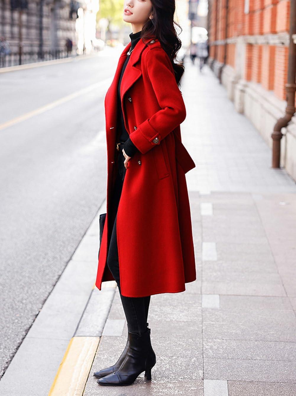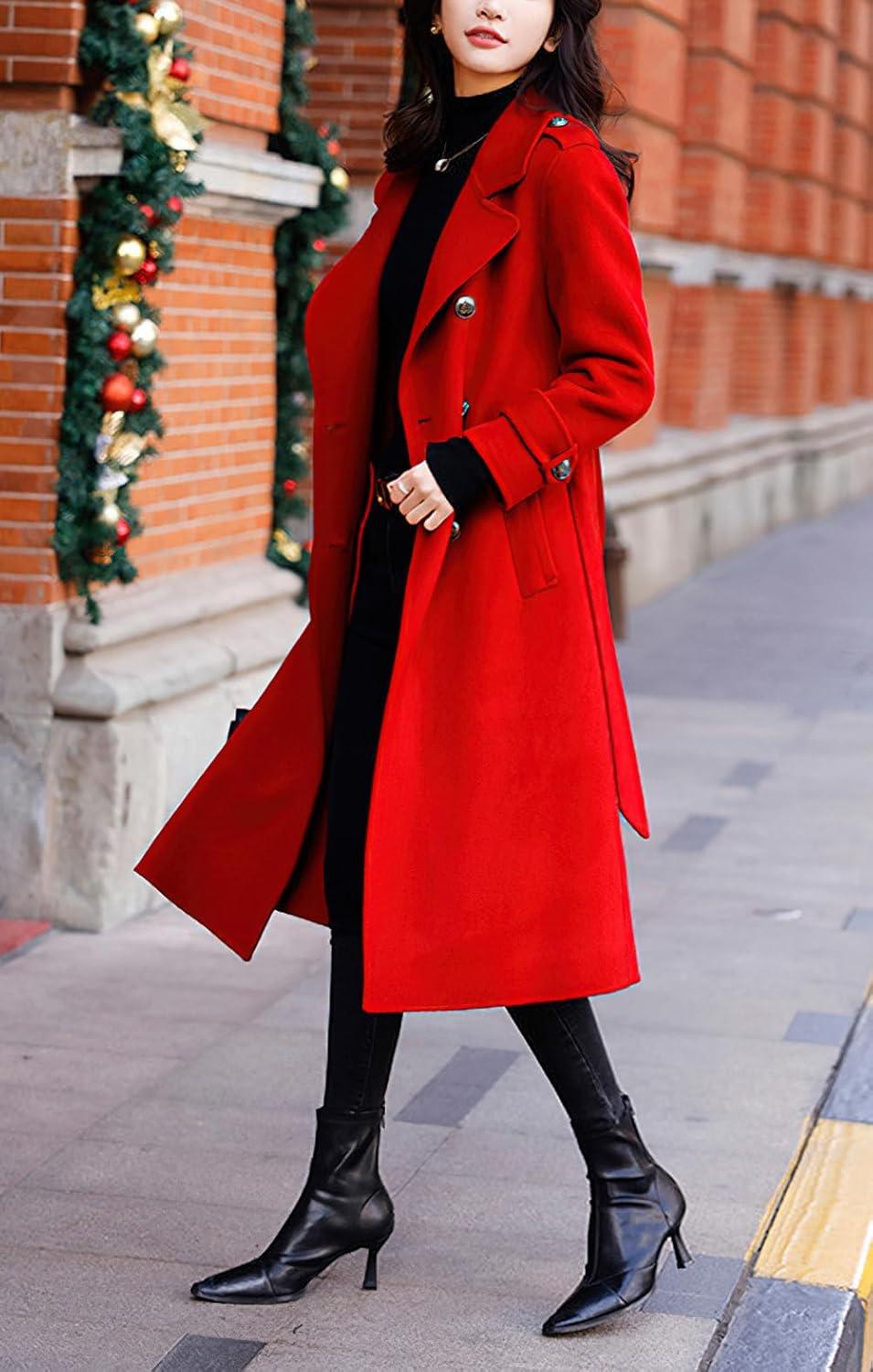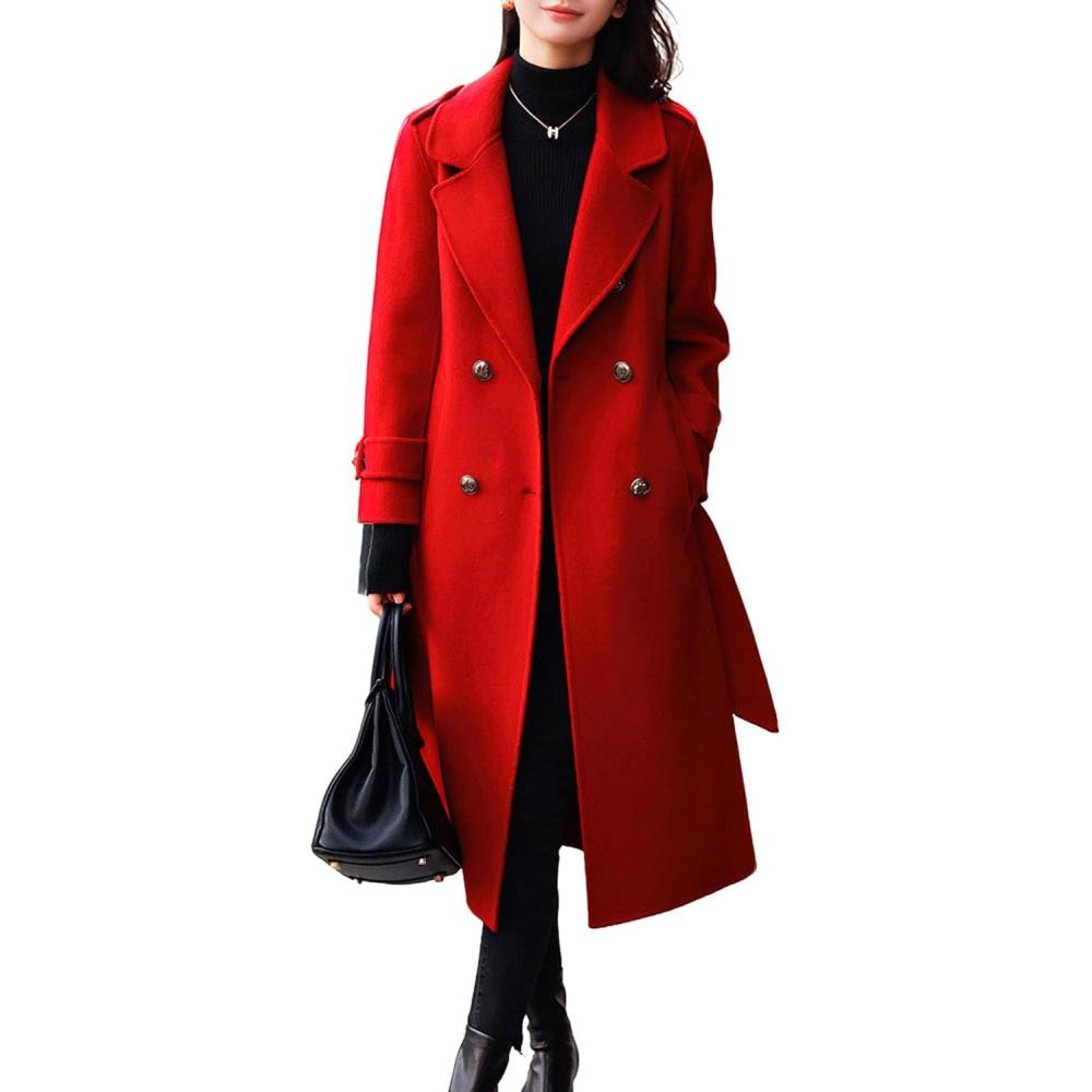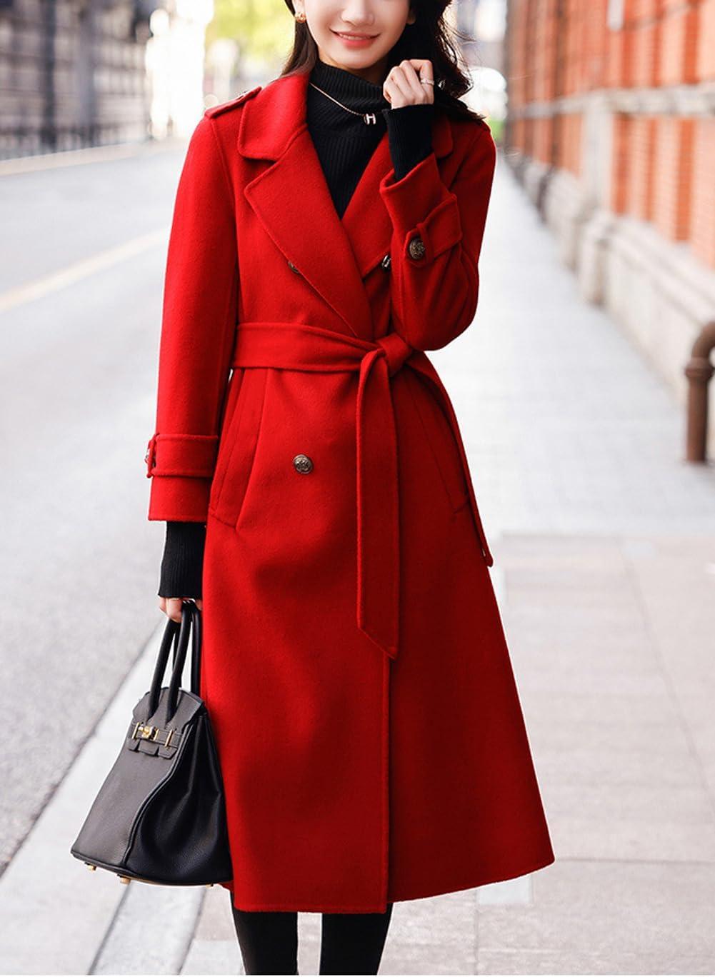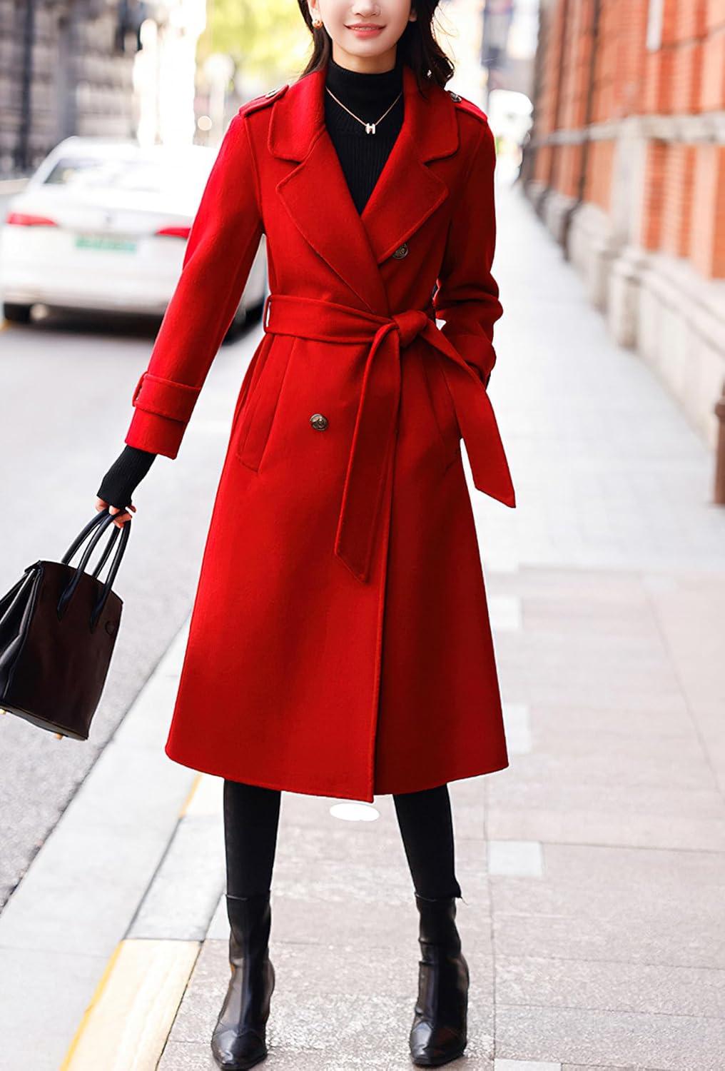 chouyatou Women's Winter Belted Wool Coat Double Breasted Midi Long Casual Trench Dressy Peacoat(Red)