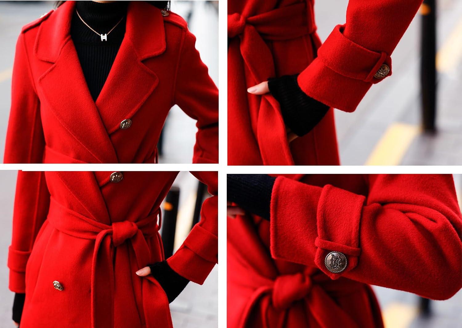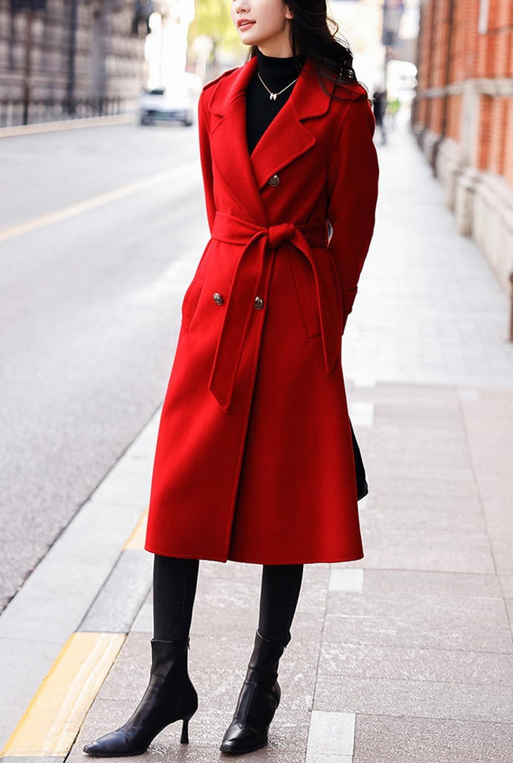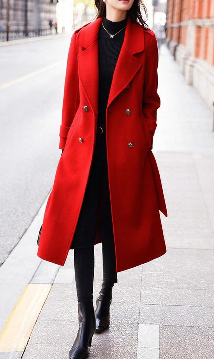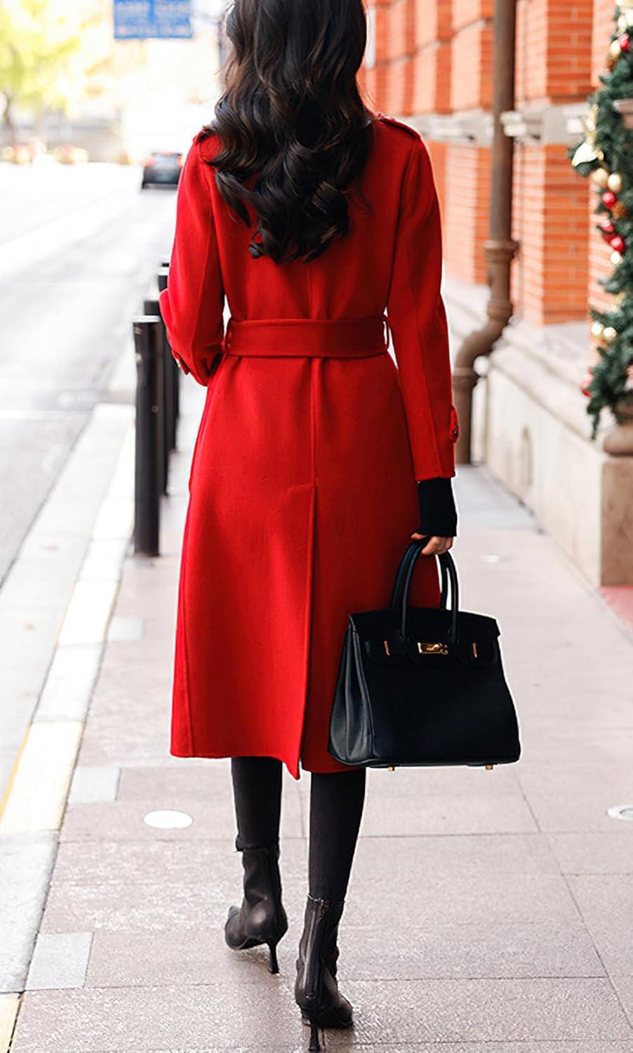 chouyatou Women's Winter Belted Wool Coat Double Breasted Midi Long Casual Trench Dressy Peacoat(Red)