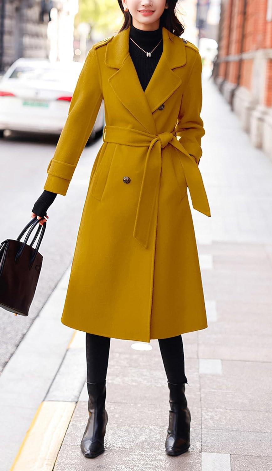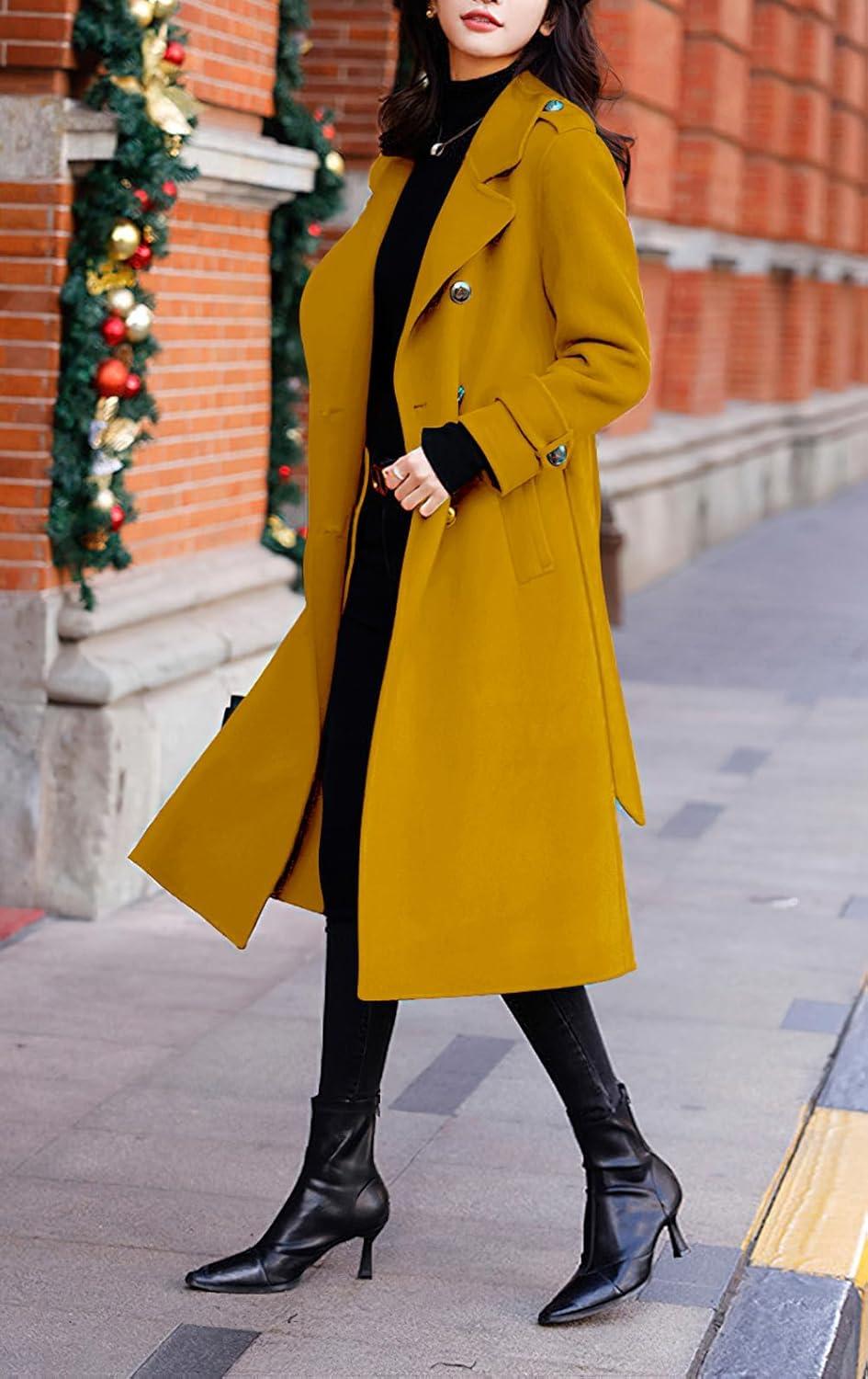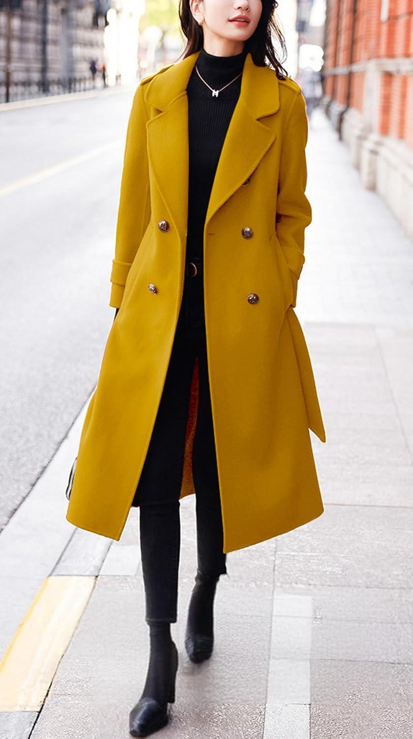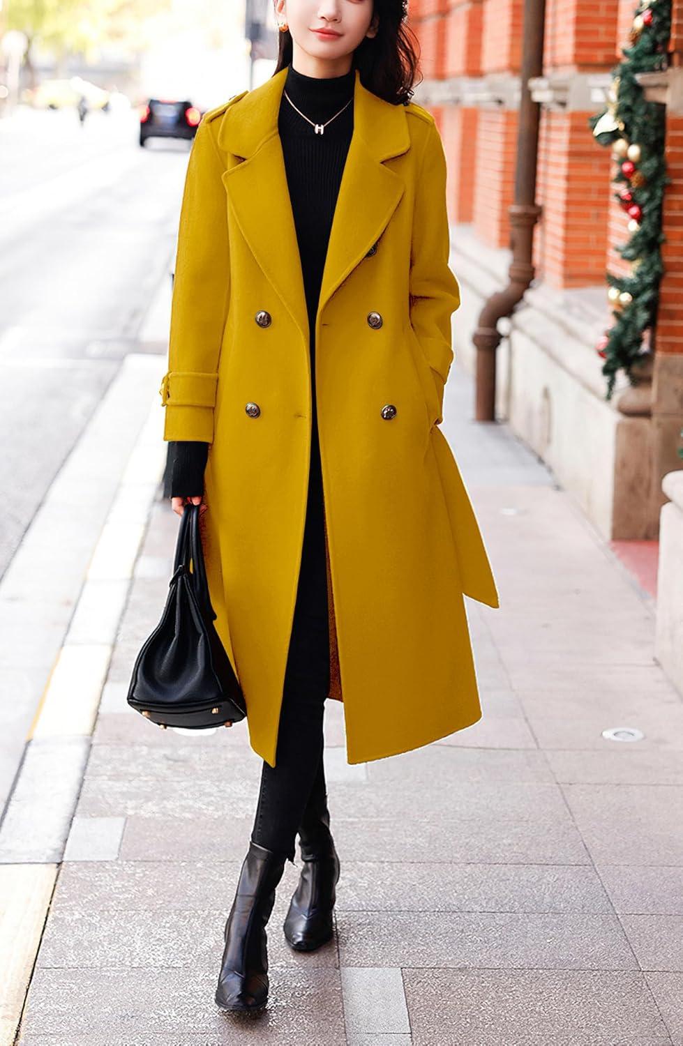 chouyatou Women's Winter Belted Wool Coat Double Breasted Midi Long Casual Trench Dressy Peacoat(Yellow)