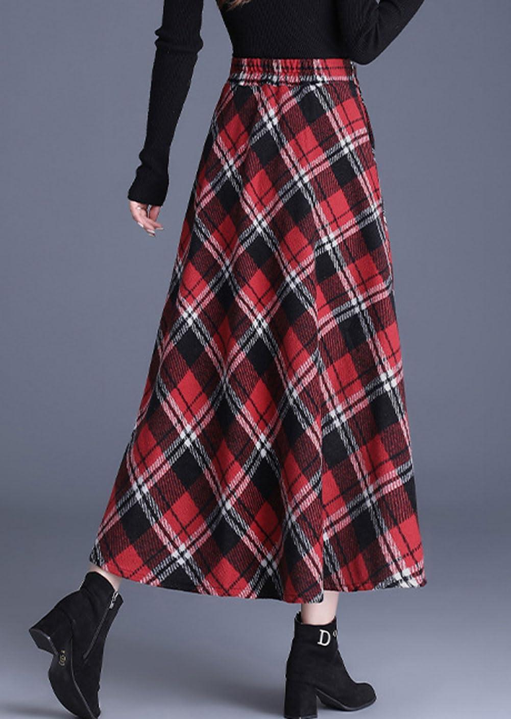 chouyatou Women's Winter Elastic Waist Wool Plaid Skirt Fall A-Line Pleated Midi Long Skater Skirt(Red Black)
