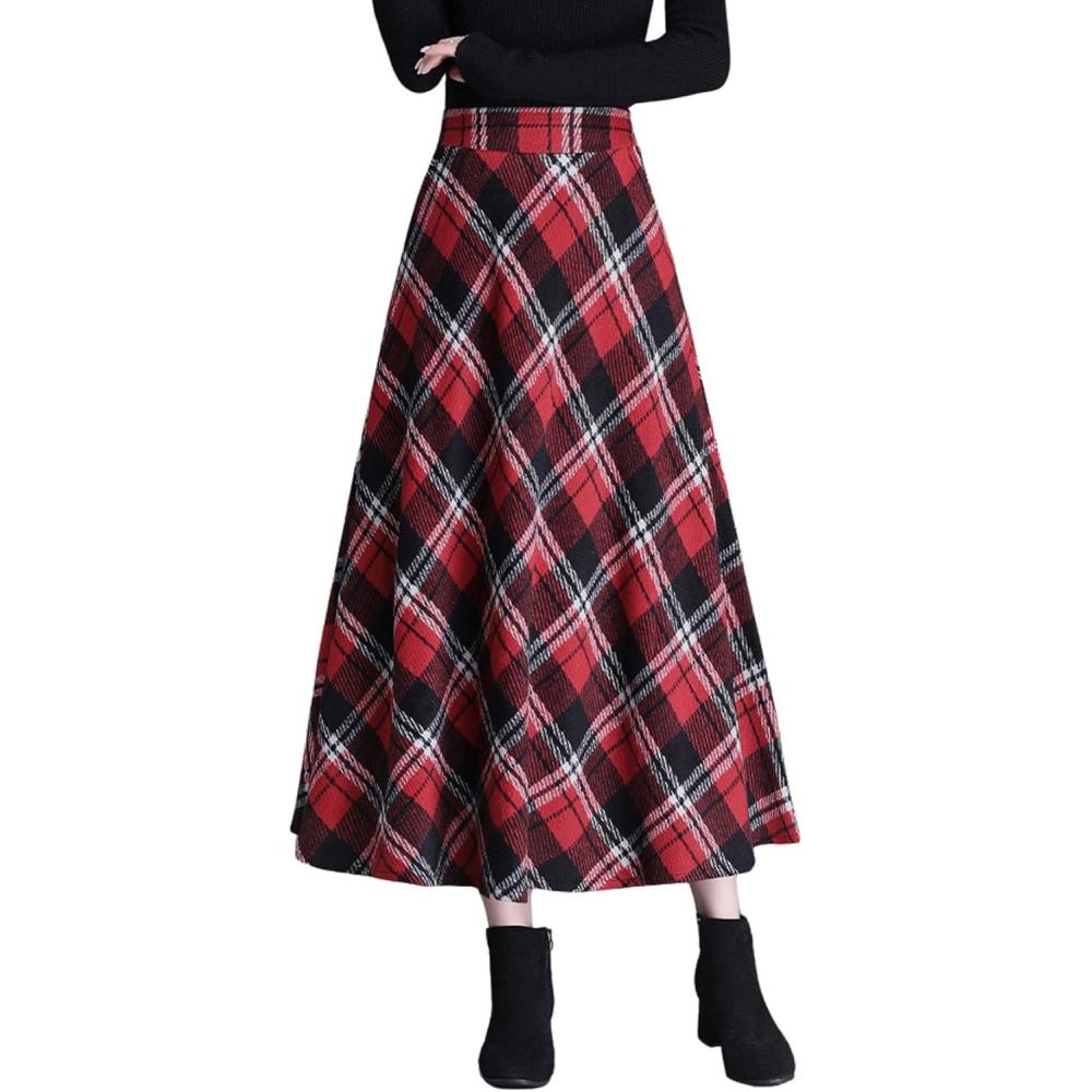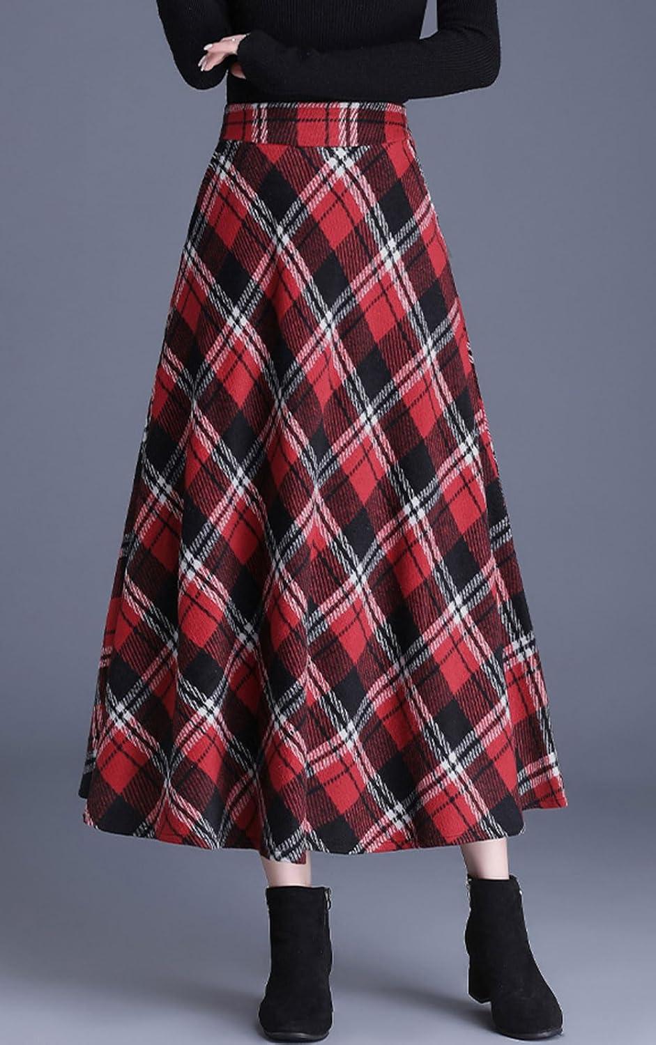 chouyatou Women’s Winter Elastic Waist Wool Plaid Skirt Fall A-Line Pleated Midi Long Skater Skirt(Red Black)