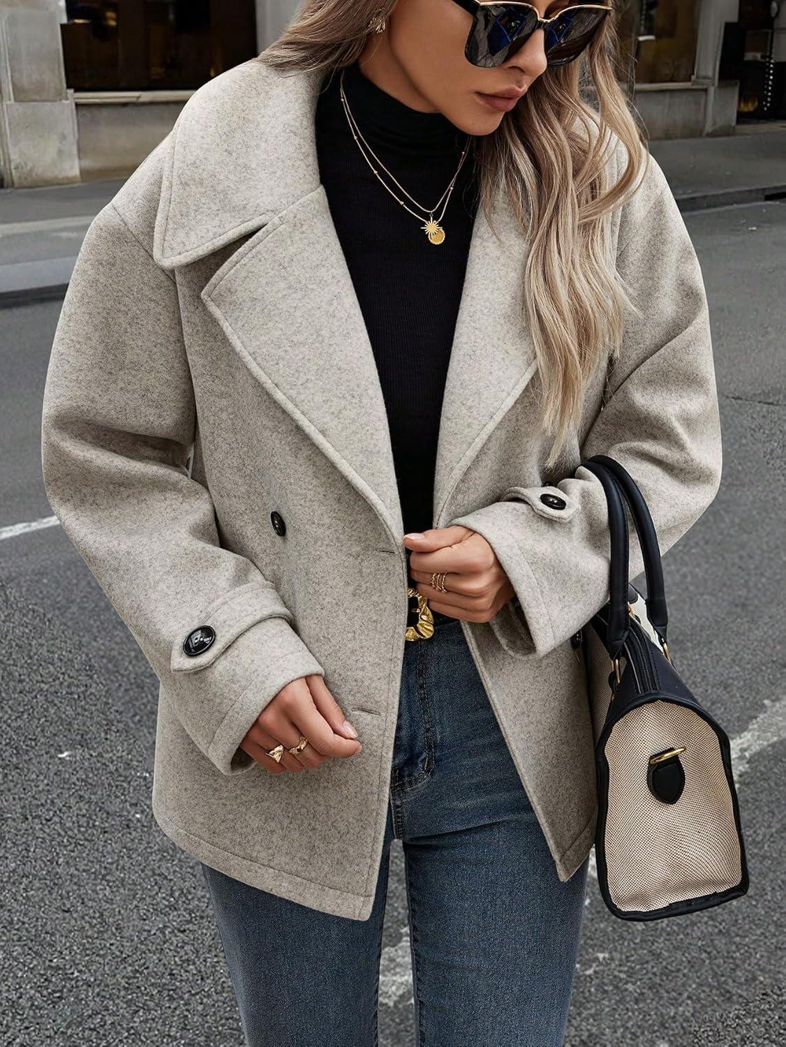 chouyatou Women’s Winter Loose Fit Cropped Wool Coat Double Breasted Dressy Short Blazer Jacket Peacoat(Light Grey)