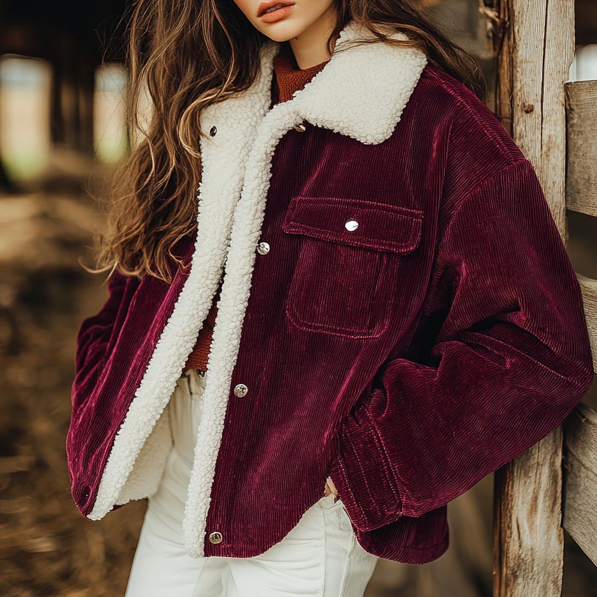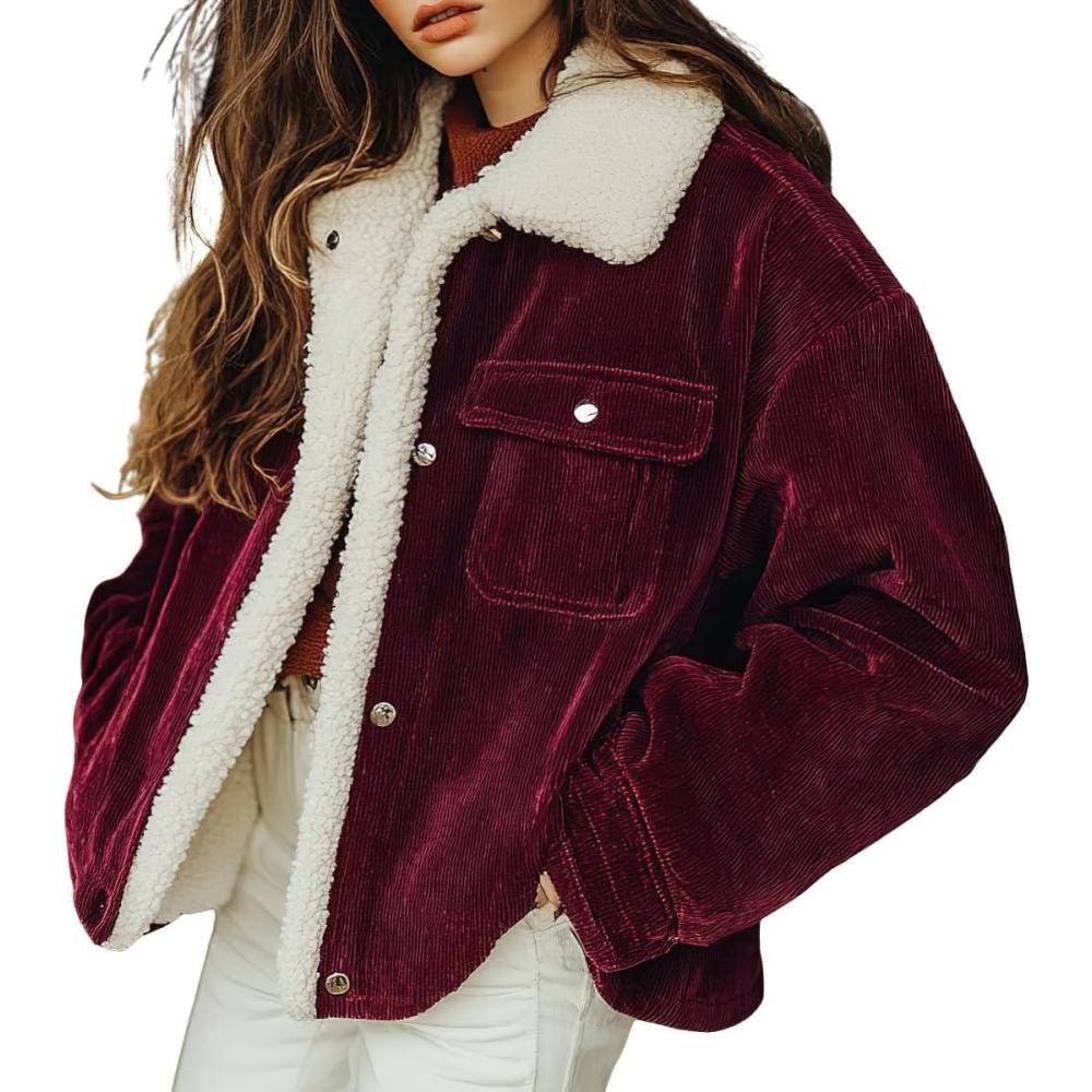 chouyatou Women’s Winter Sherpa Fleece Lined Corduroy Coat Button Down Warm Faux Fur Jacket Outerwear(Burgundy)