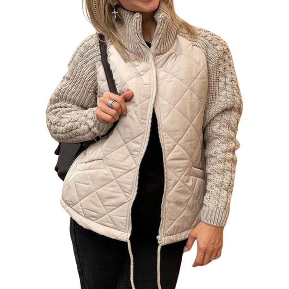 imagechouyatou Womens Winter Stand Collar Lightweight Quilted Jacket Knitted Sleeve Utility Puffer Jacket Down CoatGrey