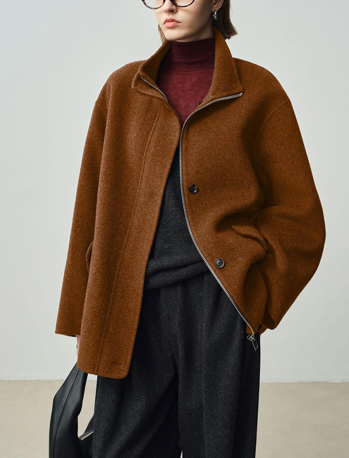 chouyatou Women's Winter Stand Collar Wool Trench Coat Zip Up Dressy Casual Short Pea Coat Overcoat with Pockets(Brown)