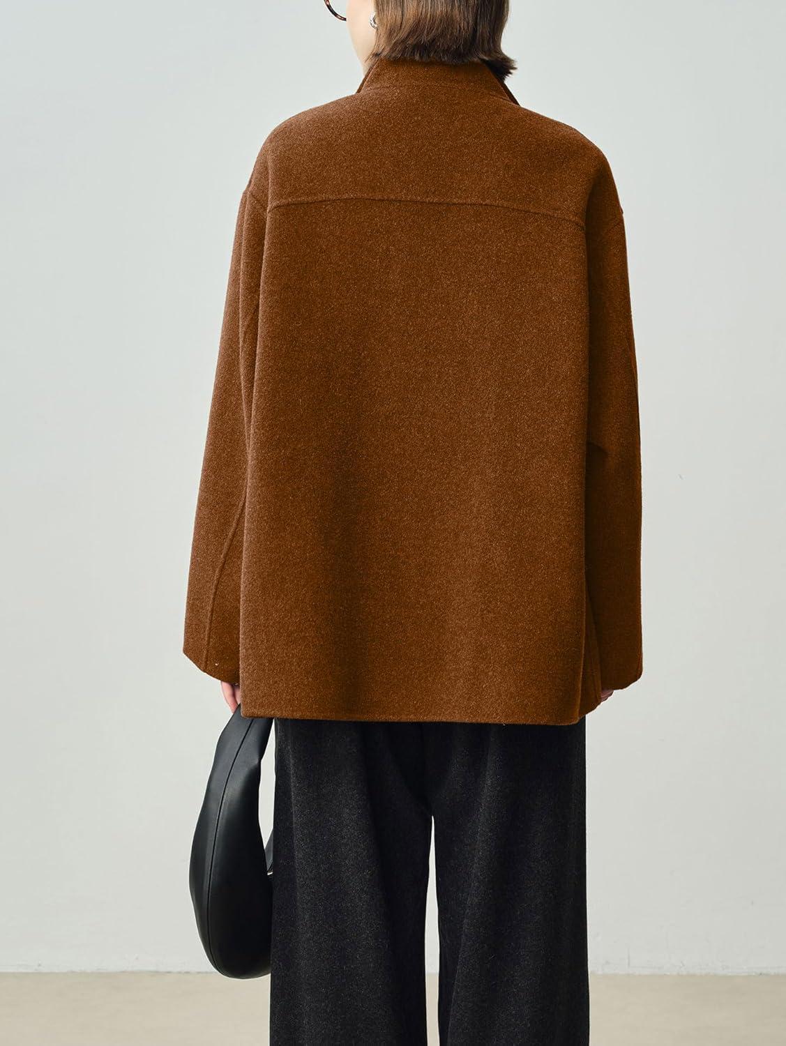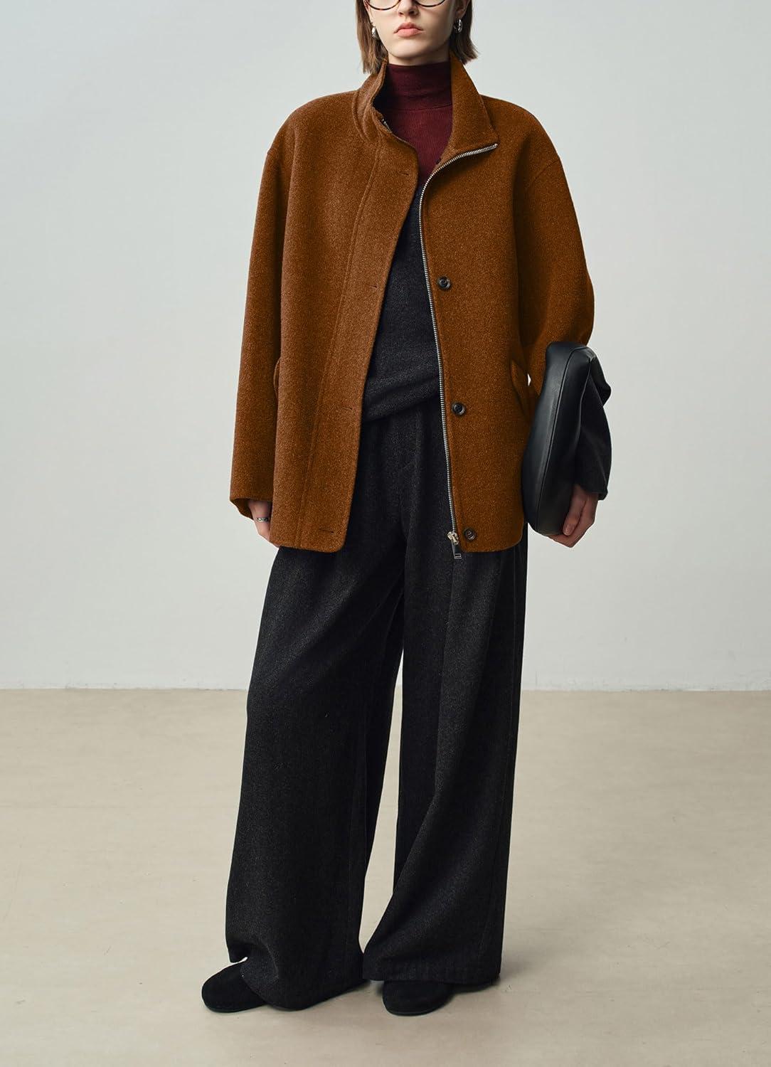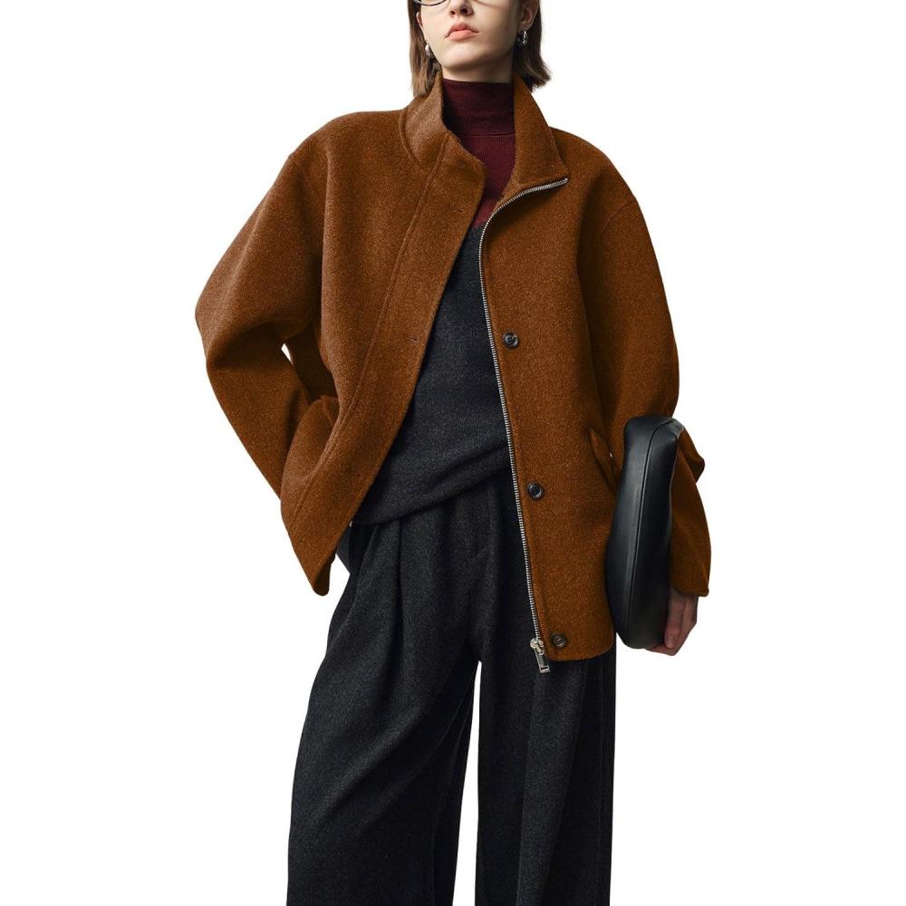 imagechouyatou Womens Winter Stand Collar Wool Trench Coat Zip Up Dressy Casual Short Pea Coat Overcoat with PocketsBrown