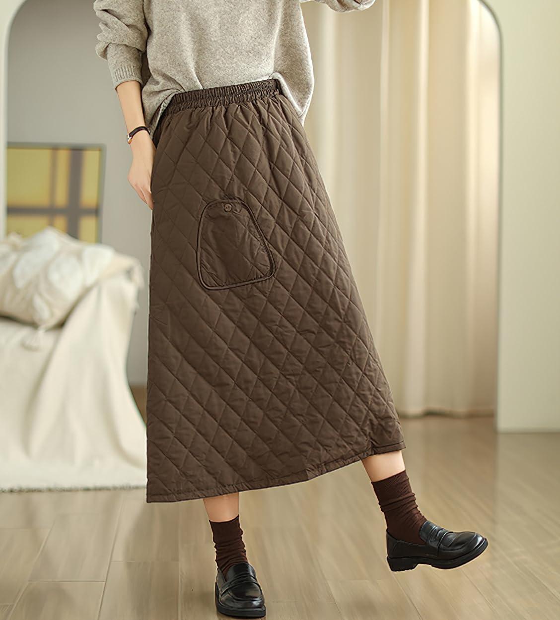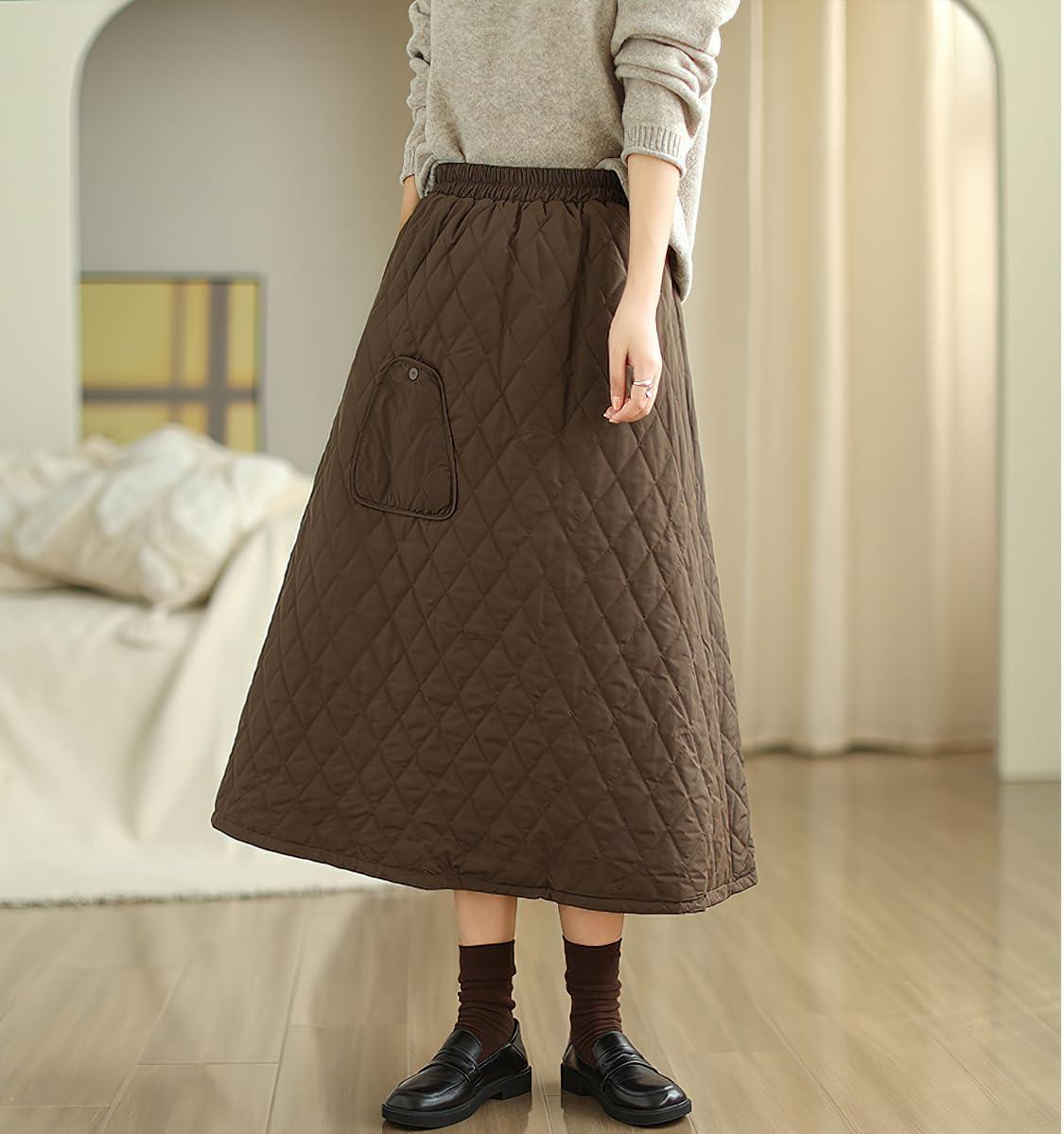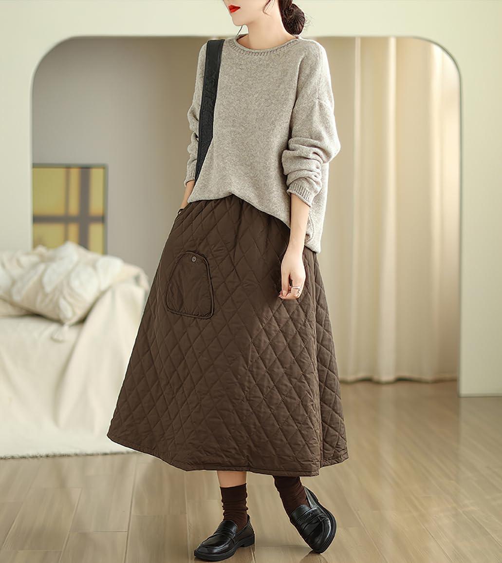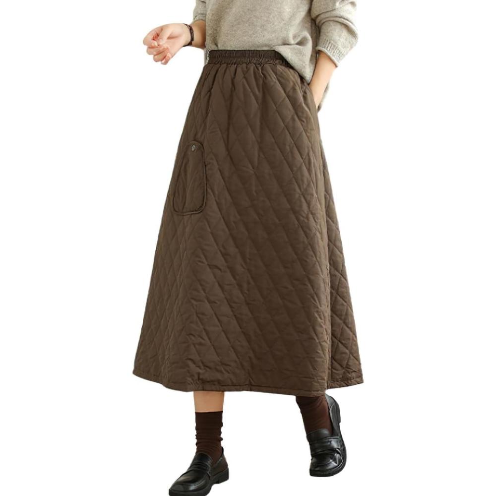chouyatou Womens Winter Warm Elastic Waist Padded Quilted Midi Long Puffer Insulated Skirt with Pocket(Brown)