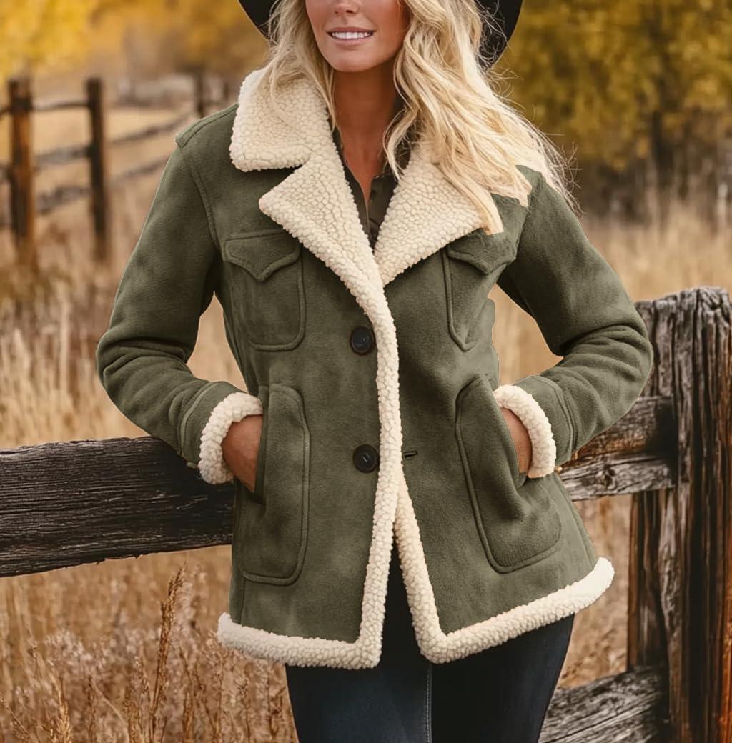 chouyatou Women's Winter Warm Notch Lapel Sherpa Fleece Lined Coat Faux Suede Jacket Outerwear(Dark Green)