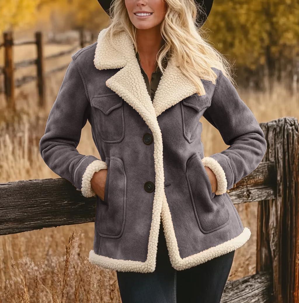 imagechouyatou Womens Winter Warm Notch Lapel Sherpa Fleece Lined Coat Faux Suede Jacket OuterwearGrey