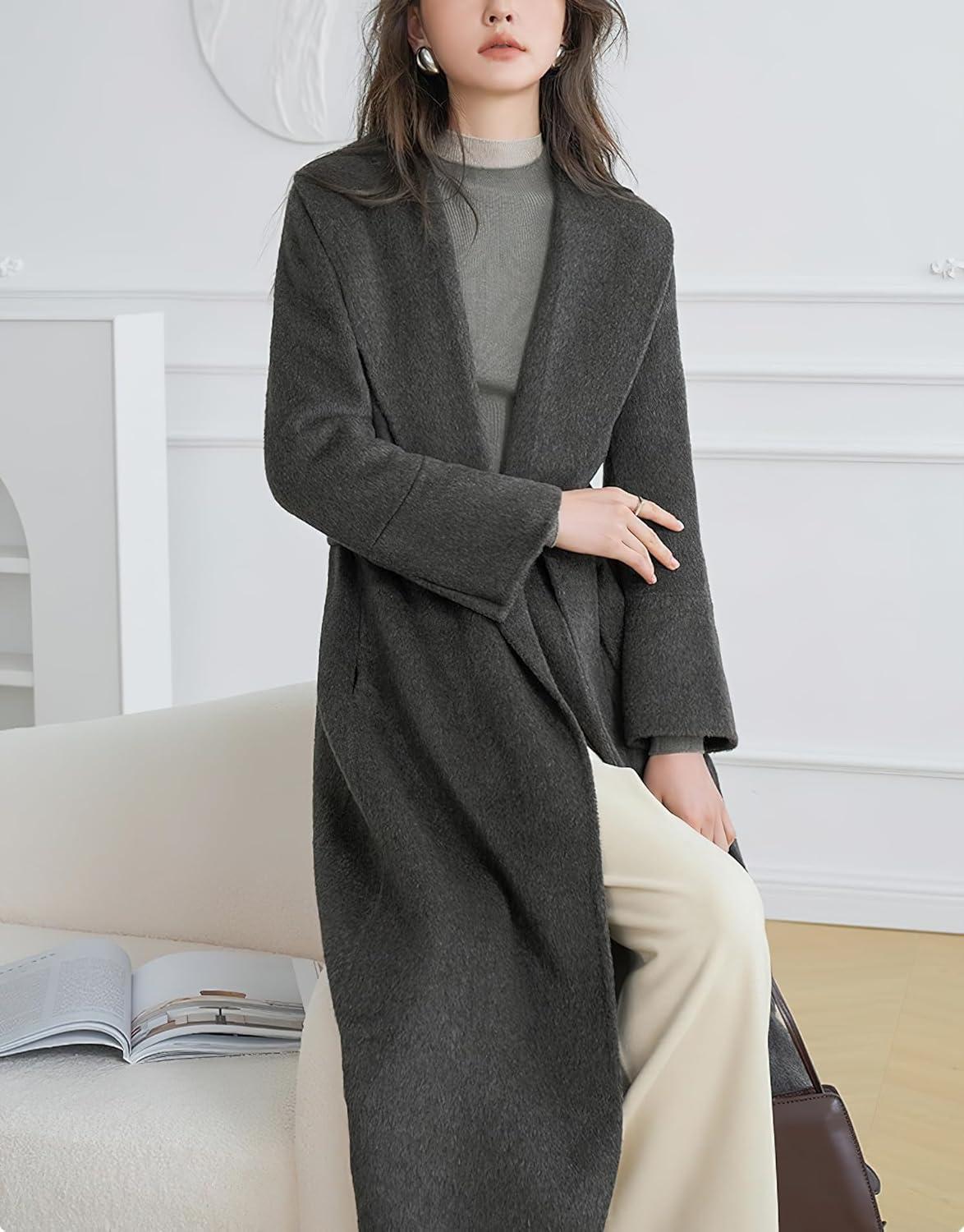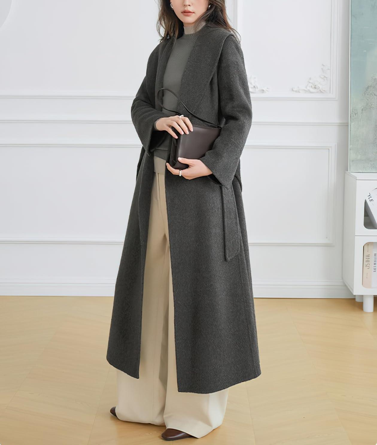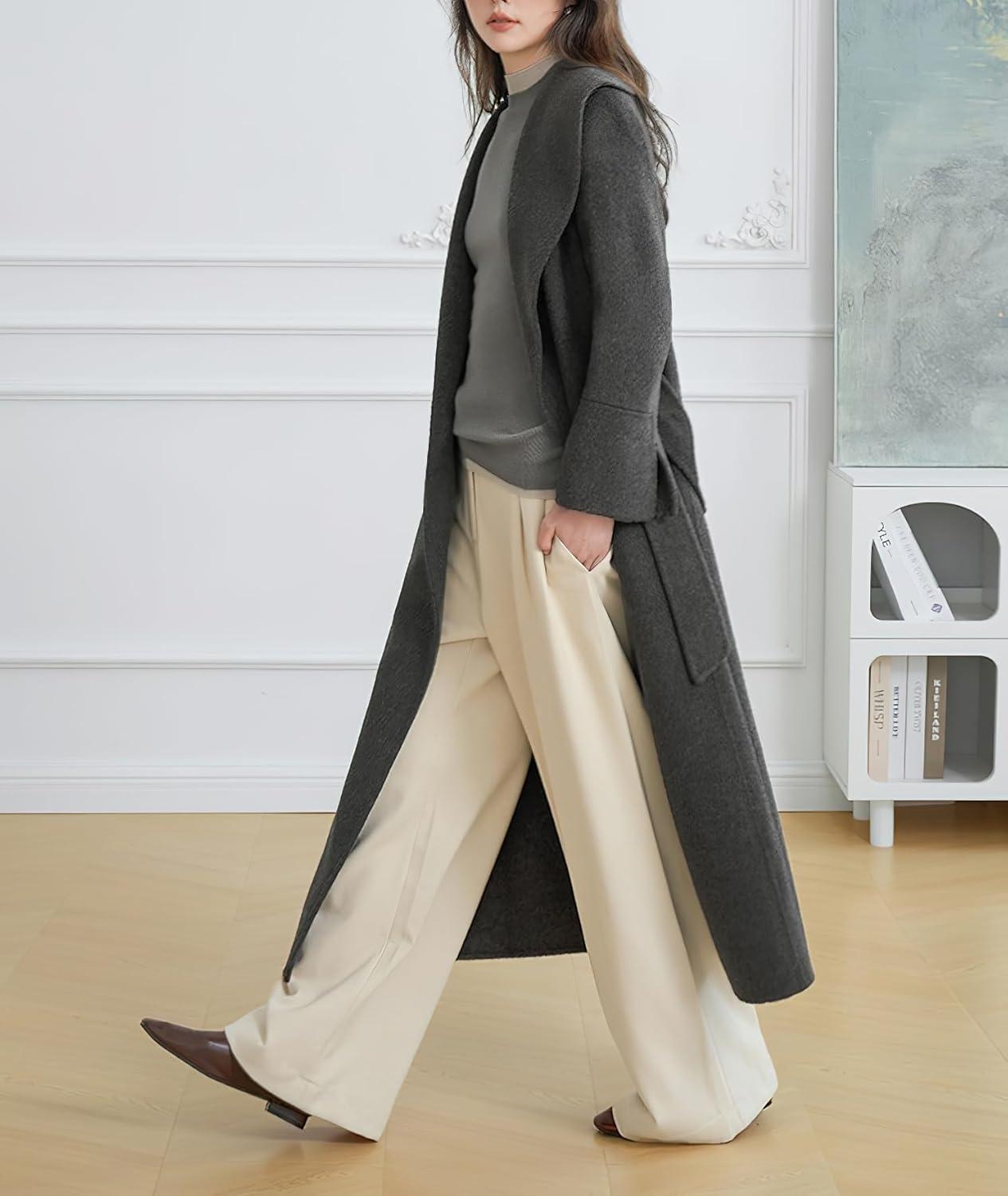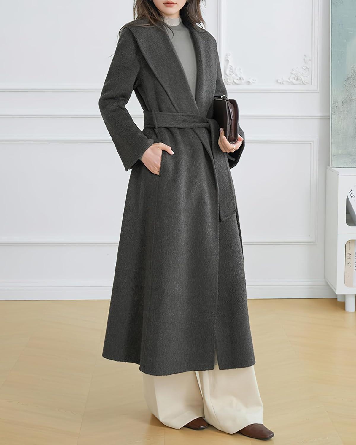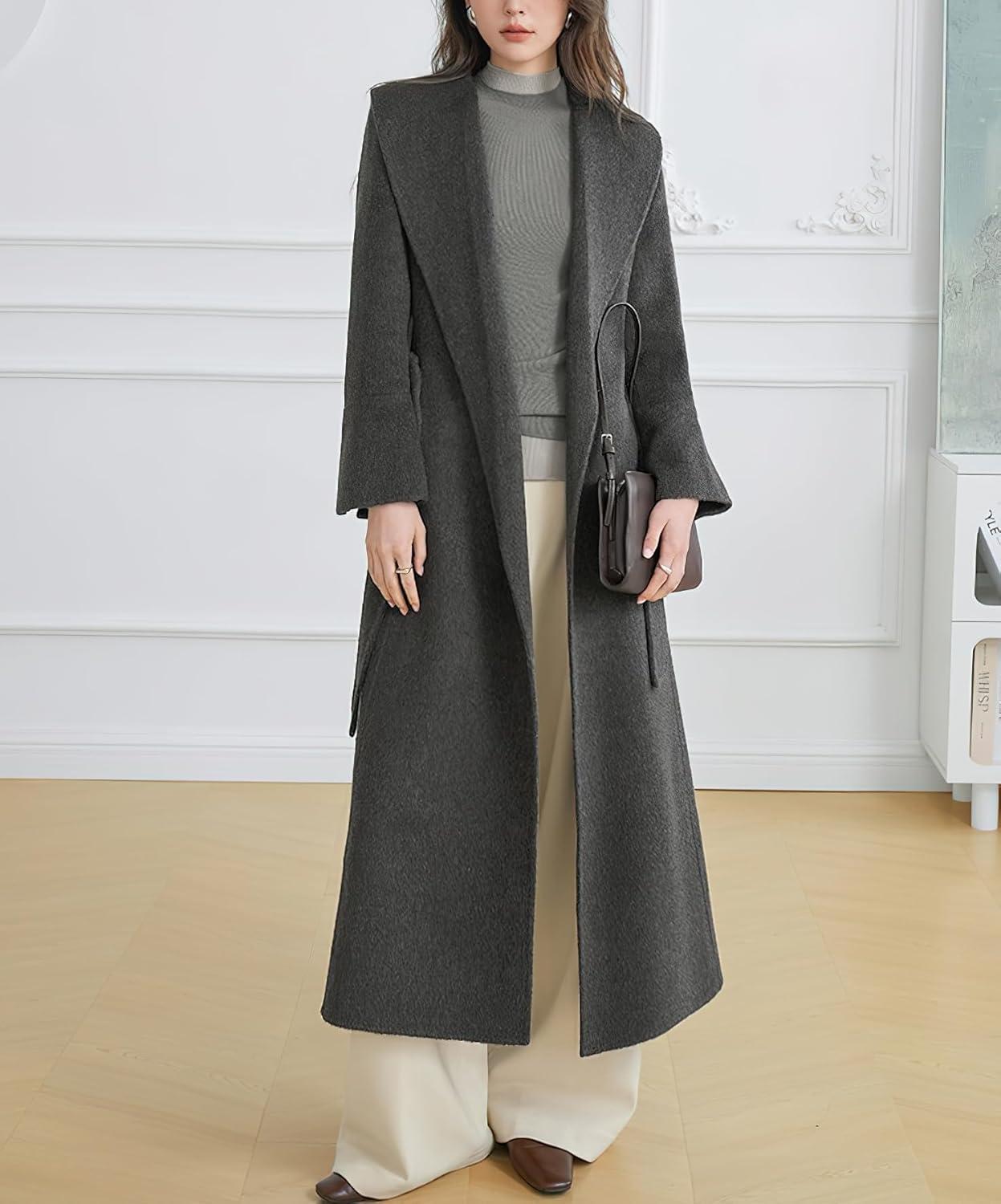 chouyatou Women's Winter Wool Trench Coat Shawl Collar Slim Fit Winter Warm Maxi Long Overcoat with Belt(Grey)