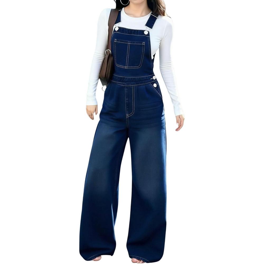 chouyatou Women’s y2k Denim Bib Overalls Adjustable Strap Wide Leg Jean Jumpsuits Loose Fit Romper Pants(Navy)